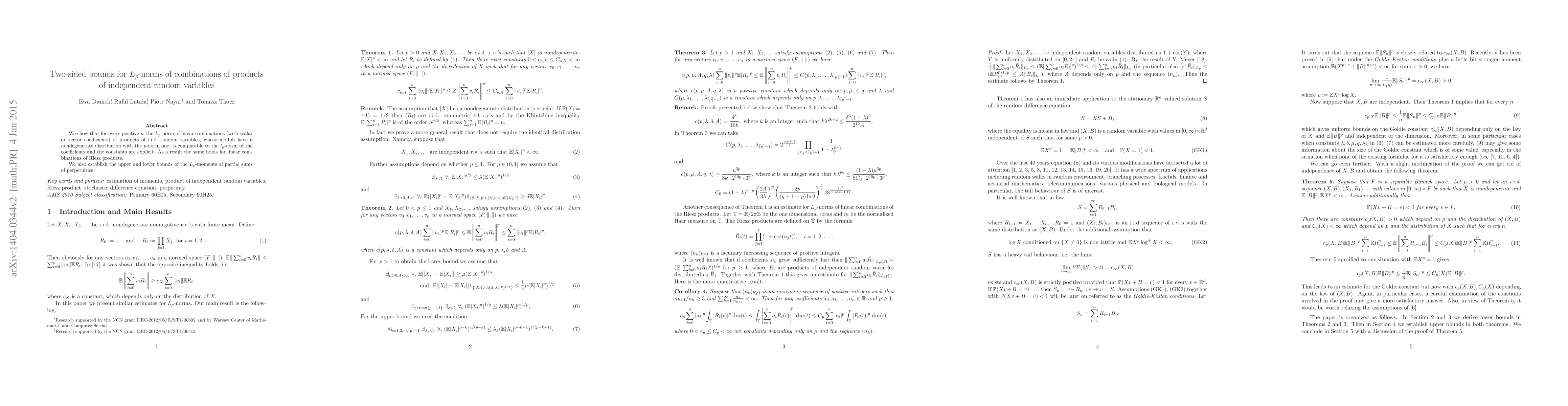 This paper provides two-sided bounds for the $L_p$-norms of linear combinations of products of independent random variables, showing their comparability to the $l_p$-norm of the coefficients. It also establishes explicit upper and lower bounds for the $L_p$-moments of partial sums of perpetuities.