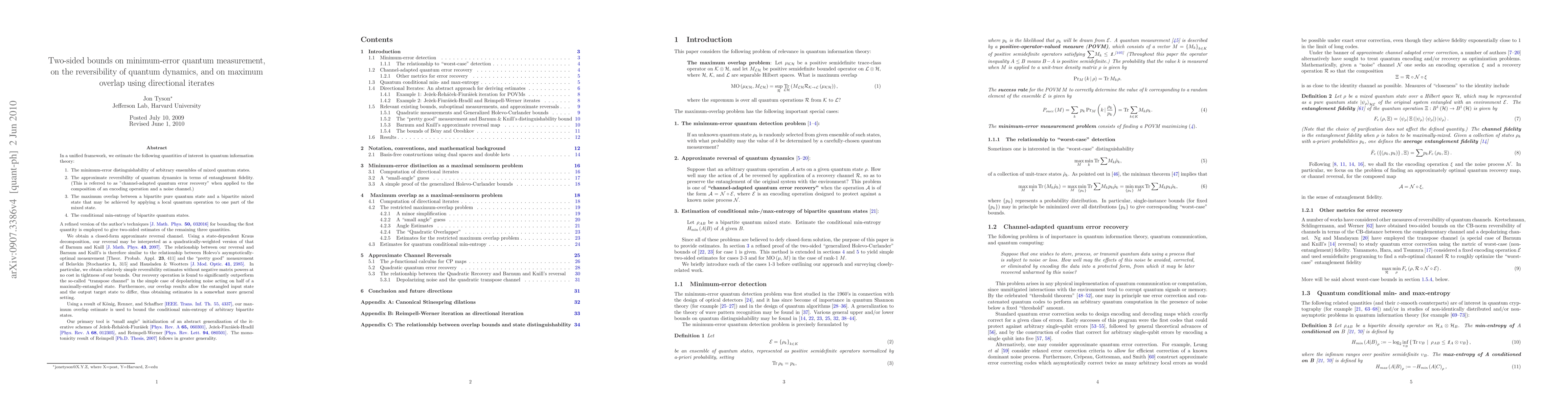 This paper provides two-sided bounds for minimum-error distinguishability of quantum states, approximate reversibility of quantum dynamics, maximum overlap between quantum states, and conditional min-entropy using a refined iterative scheme. The approach leverages "small angle" initialization of directional iterates to achieve these estimates.