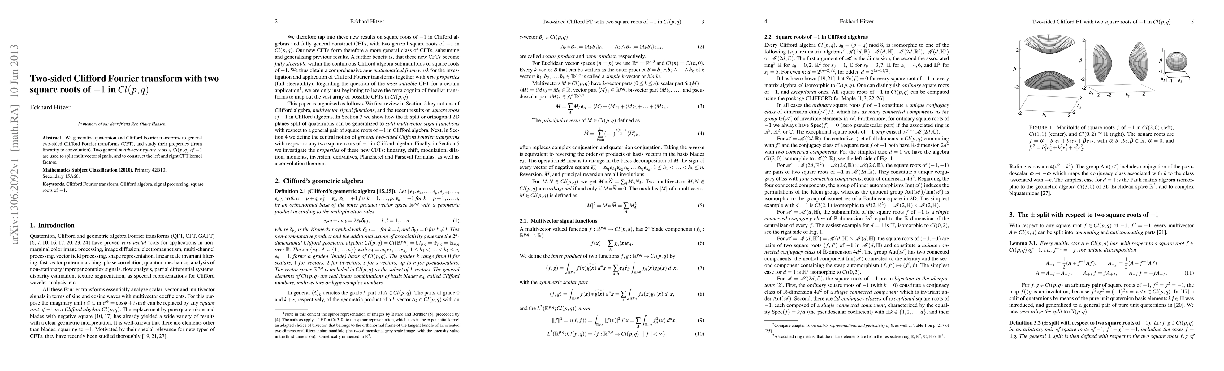 This paper generalizes quaternion and Clifford Fourier transforms into two-sided Clifford Fourier transforms (CFT) using two multivector square roots of -1 in Cl(p,q). The study explores properties from linearity to convolution and applies these transforms to split and construct CFT kernel factors for signal processing.