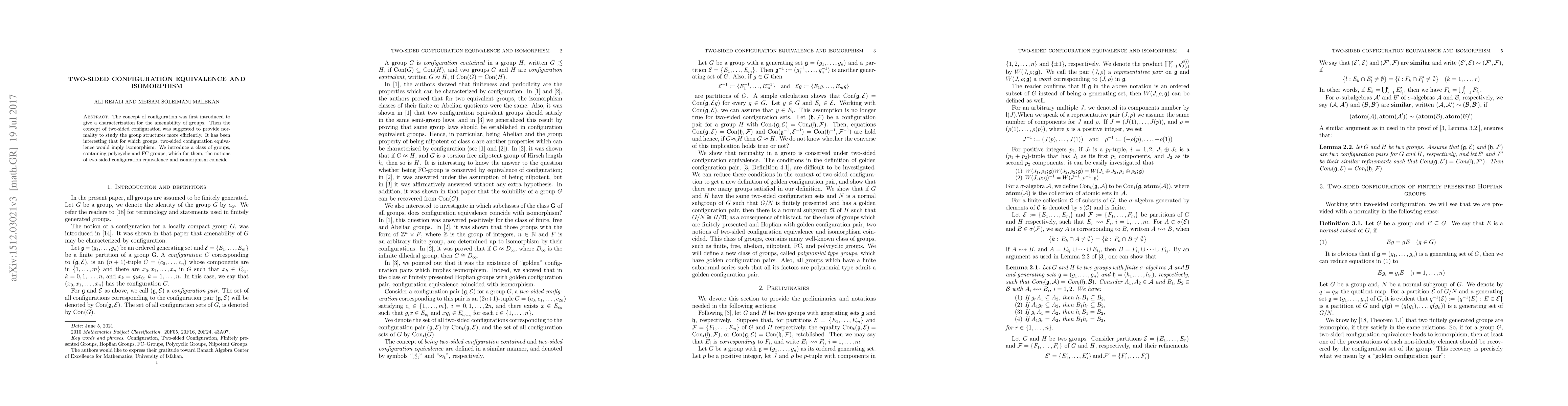 The concept of configuration was first introduced to give a characterization for the amenability of groups. Then the concept of two-sided configuration was suggested to provide normality to study the group structures more efficiently. It has been interesting that for which groups, two-sided configuration equivalence would imply isomorphism. We introduce a class of groups, containing polycyclic and FC groups, which for them, the notions of two-sided configuration equivalence and isomorphism coincide.