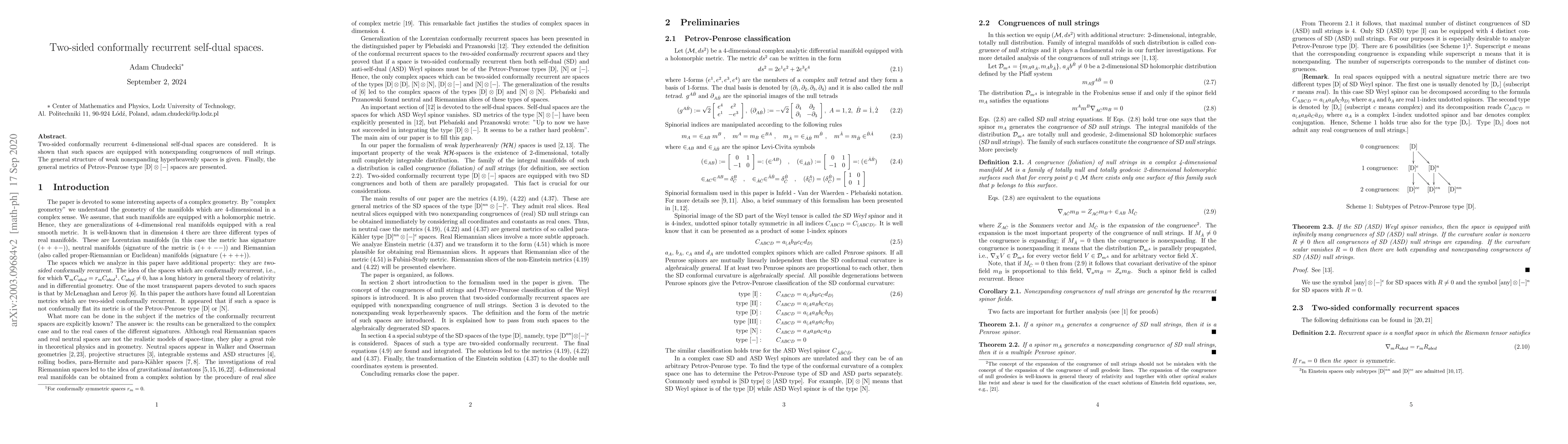 This paper explores two-sided conformally recurrent 4-dimensional self-dual spaces, demonstrating their association with nonexpanding congruences of null strings. It also outlines the structure of weak nonexpanding hyperheavenly spaces and presents the general metrics of Petrov-Penrose type $[D] x [-]$ spaces.
