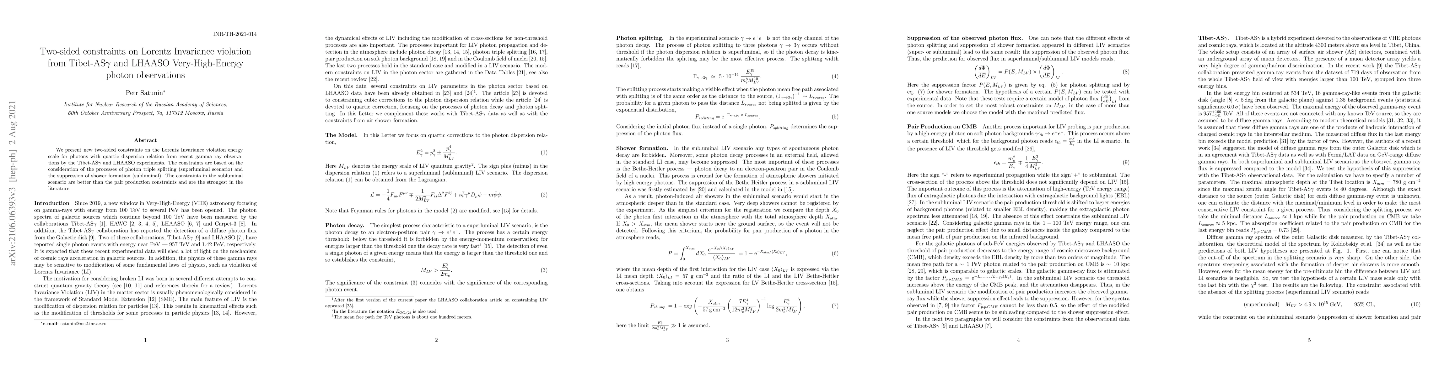 We present new two-sided constraints on Lorentz Invariance violation energy scale for photons with quartic dispersion relation from recent gamma ray observations by Tibet-AS$\gamma$ and LHAASO experiments. The constraints are based on the consideration of the processes of photon triple splitting (superluminal scenario) and the suppression of shower formation (subluminal). The constraints in subluminal scenario are better than the pair production constraints and are the strongest in the literature.