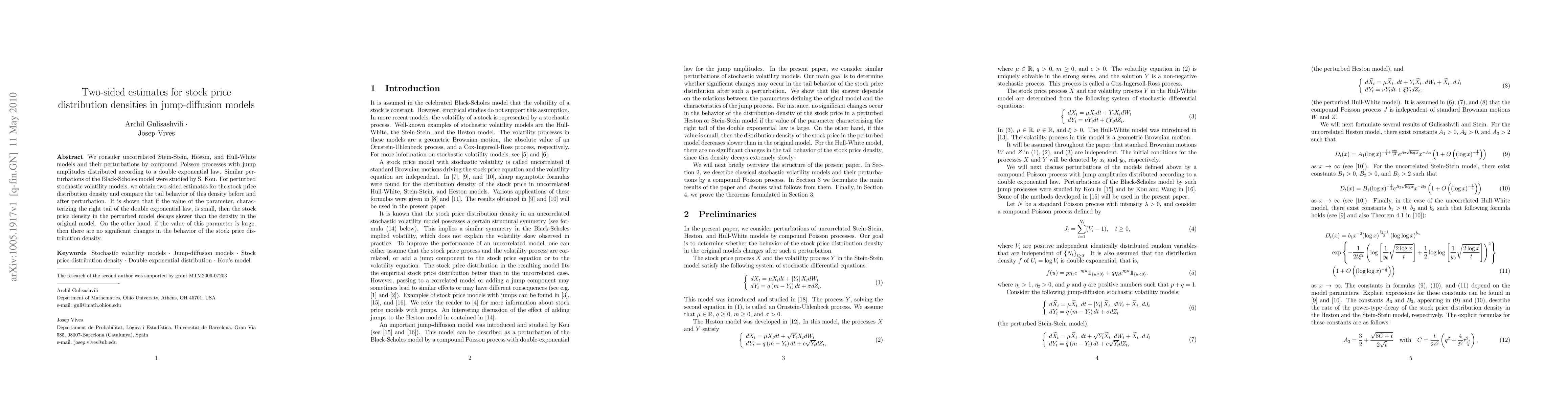 We consider uncorrelated Stein-Stein, Heston, and Hull-White models and their perturbations by compound Poisson processes with jump amplitudes distributed according to a double exponential law. Similar perturbations of the Black-Scholes model were studied by S. Kou. For perturbed stochastic volatility models, we obtain two-sided estimates for the stock price distribution density and compare the tail behavior of this density before and after perturbation. It is shown that if the value of the parameter, characterizing the right tail of the double exponential law, is small, then the stock price density in the perturbed model decays slower than the density in the original model. On the other hand, if the value of this parameter is large, then there are no significant changes in the behavior of the stock price distribution density.
