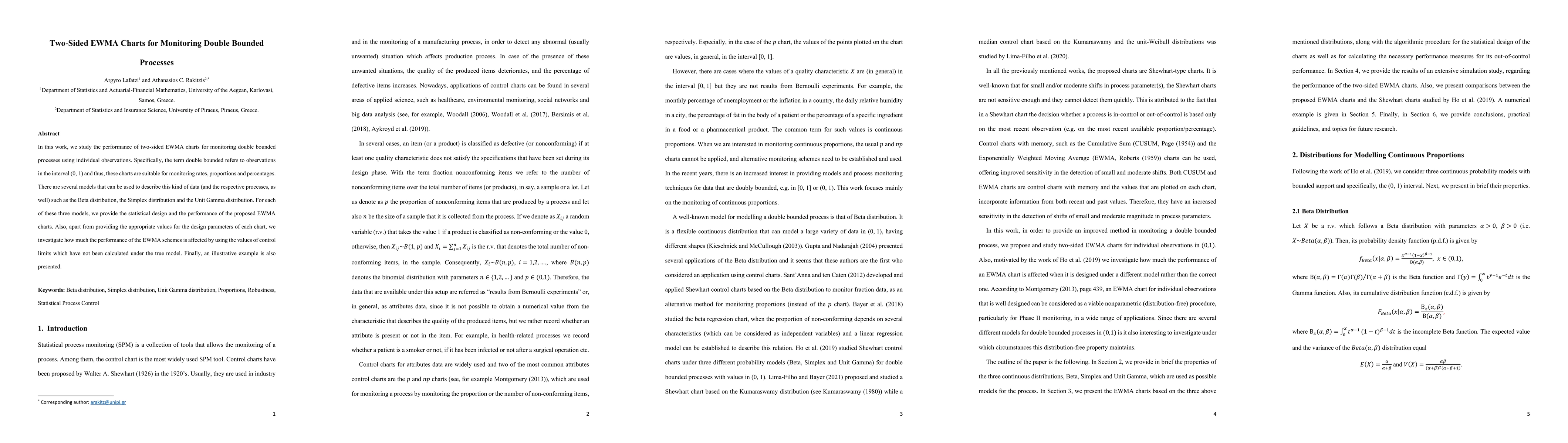 This paper evaluates the performance of two-sided EWMA charts for monitoring double bounded processes, specifically rates, proportions, and percentages within the interval (0, 1). It examines three statistical models—Beta, Simplex, and Unit Gamma distributions—and provides design and performance analysis for each, along with an illustrative example.