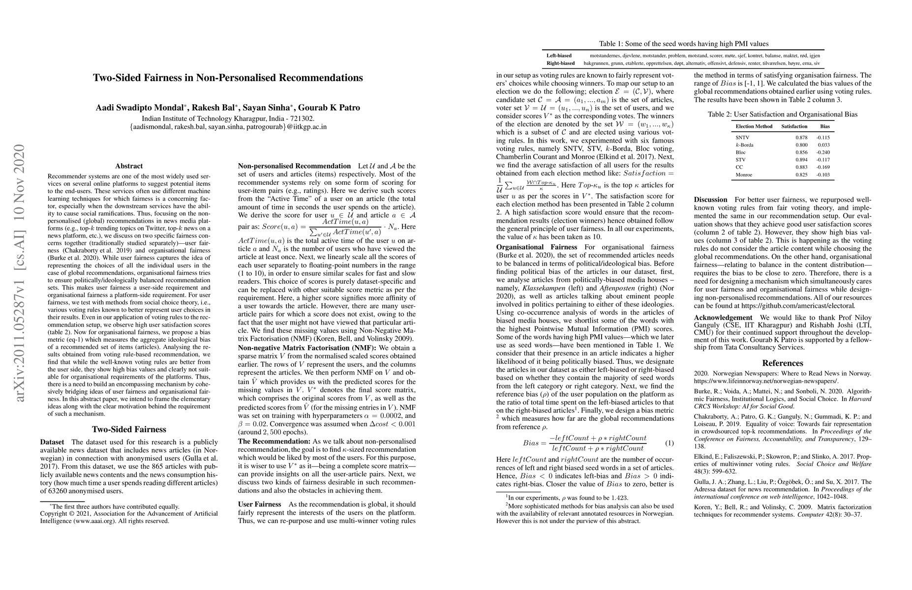 Recommender systems are one of the most widely used services on several online platforms to suggest potential items to the end-users. These services often use different machine learning techniques for which fairness is a concerning factor, especially when the downstream services have the ability to cause social ramifications. Thus, focusing on the non-personalised (global) recommendations in news media platforms (e.g., top-k trending topics on Twitter, top-k news on a news platform, etc.), we discuss on two specific fairness concerns together (traditionally studied separately)---user fairness and organisational fairness. While user fairness captures the idea of representing the choices of all the individual users in the case of global recommendations, organisational fairness tries to ensure politically/ideologically balanced recommendation sets. This makes user fairness a user-side requirement and organisational fairness a platform-side requirement. For user fairness, we test with methods from social choice theory, i.e., various voting rules known to better represent user choices in their results. Even in our application of voting rules to the recommendation setup, we observe high user satisfaction scores. Now for organisational fairness, we propose a bias metric which measures the aggregate ideological bias of a recommended set of items (articles). Analysing the results obtained from voting rule-based recommendation, we find that while the well-known voting rules are better from the user side, they show high bias values and clearly not suitable for organisational requirements of the platforms. Thus, there is a need to build an encompassing mechanism by cohesively bridging ideas of user fairness and organisational fairness. In this abstract paper, we intend to frame the elementary ideas along with the clear motivation behind the requirement of such a mechanism.