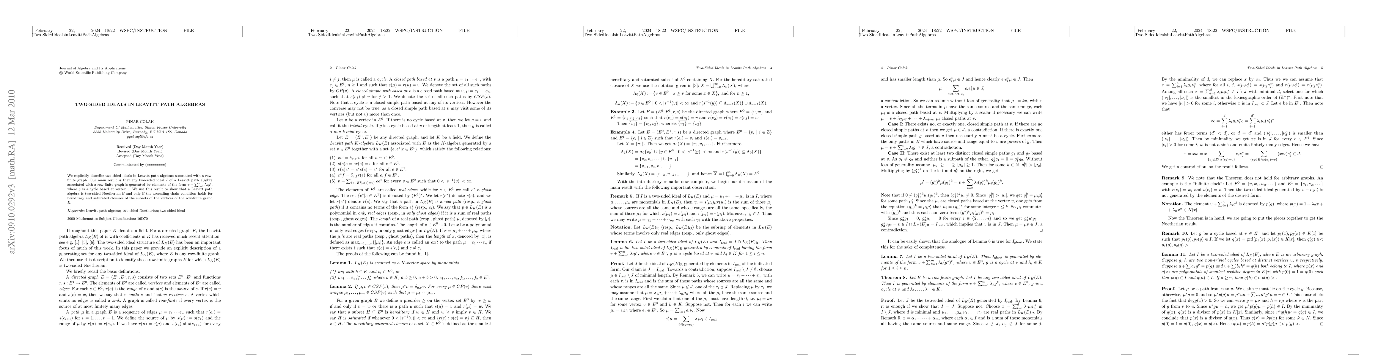 This paper characterizes two-sided ideals in Leavitt path algebras linked to row-finite graphs, proving they are generated by elements involving cycles based at vertices. It also establishes a connection between the two-sided Noetherian property of these algebras and the ascending chain condition for hereditary and saturated closures of graph vertex subsets.