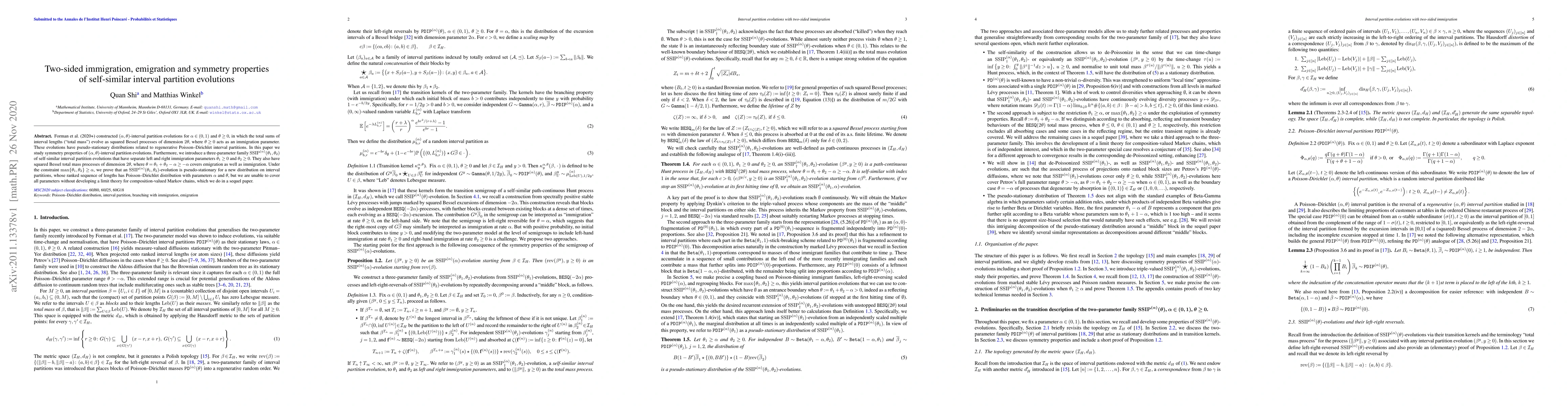 The research employs a two-sided immigration, emigration, and symmetry properties analysis of self-similar interval partition evolutions, extending the work of Forman et al. (2020+). It introduces a three-parameter family ${\rm SSIP}^{(\alpha)}(\theta_1,\theta_2)$ of self-similar interval partition evolutions with separate left and right immigration parameters.