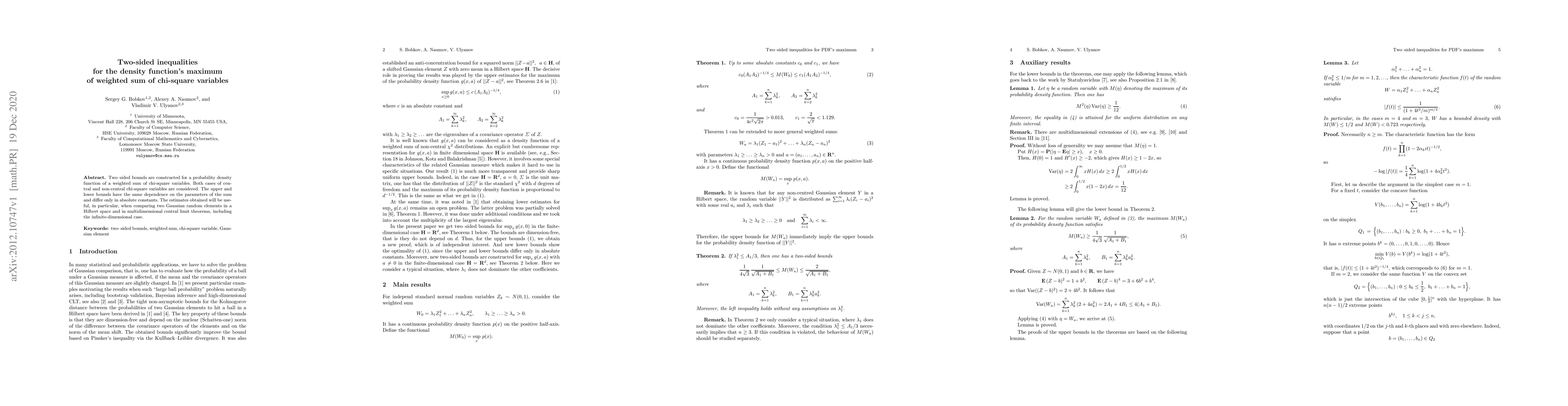 This paper constructs two-sided bounds for the probability density function of a weighted sum of chi-square variables, applicable to both central and non-central cases. The derived upper and lower bounds share parameter dependencies but differ only in absolute constants, useful for comparing Gaussian random elements and in multidimensional central limit theorems.