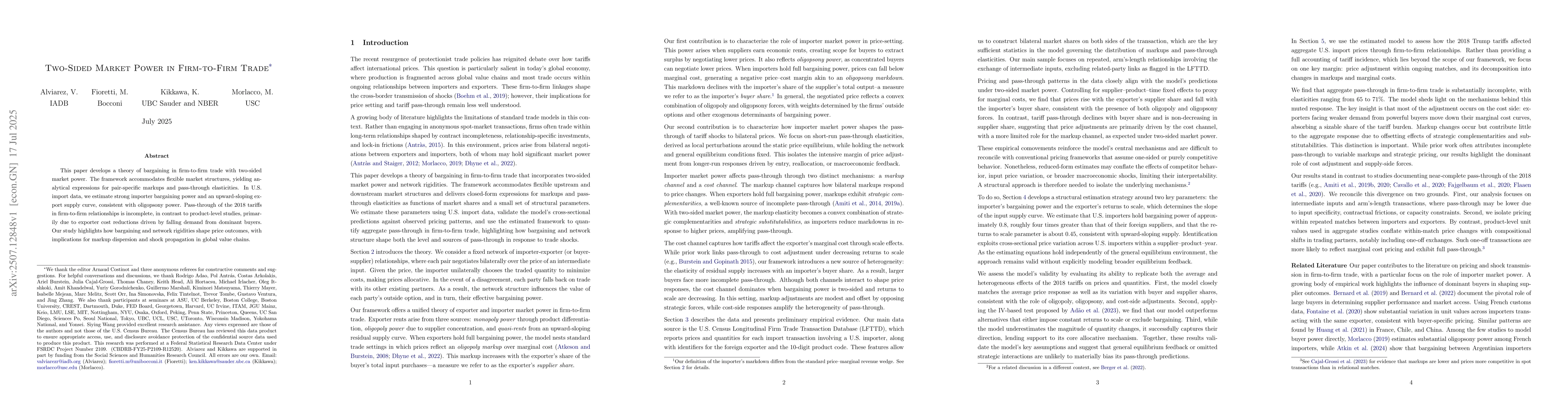 This paper develops a theory of bargaining in firm-to-firm trade with two-sided market power. The framework accommodates flexible market structures, yielding analytical expressions for pair-specific markups and pass-through elasticities. In U.S. import data, we estimate strong importer bargaining power and an upward-sloping export supply curve, consistent with oligopsony power. Pass-through of the 2018 tariffs in firm-to-firm relationships is incomplete, in contrast to product-level studies, primarily due to exporter cost reductions driven by falling demand from dominant buyers. Our study highlights how bargaining and network rigidities shape price outcomes, with implications for markup dispersion and shock propagation in global value chains.