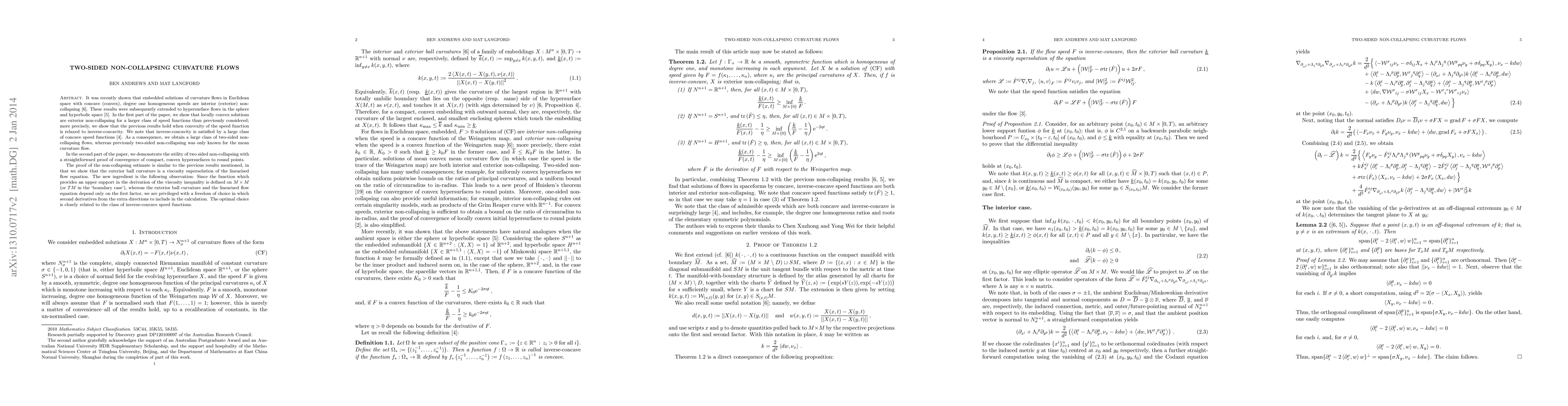 It was recently proved that embedded solutions of Euclidean hypersurface flows with speeds given by concave (convex), degree one homogeneous functions of the Weingarten map are interior (exterior) non-collapsing. These results were subsequently extended to hypersurface flows in the sphere and hyperbolic space. In the first part of the paper, we show that locally convex solutions are exterior non-collapsing for a larger class of speed functions than previously considered; more precisely, we show that the previous results hold when convexity of the speed function is relaxed to inverse-concavity. We note that inverse-concavity is satisfied by a large class of concave speed functions. As a consequence, we obtain a large class of two-sided non-collapsing flows, whereas previously two-sided non-collapsing was only known for the mean curvature flow. In the second part of the paper, we demonstrate the utility of two sided non-collapsing with a straightforward proof of convergence of compact, convex hypersurfaces to round points. The proof of the non-collapsing estimate is similar to the previous results mentioned, in that we show that the exterior ball curvature is a viscosity supersolution of the linearised flow. The new ingredient is the following observation: Since the function which provides an upper support in the derivation of the viscosity inequality is defined on $M\times M$ (or $TM$ in the `boundary case'), whereas the exterior ball curvature and the linearised flow equation depend only on the first factor, we are privileged with a freedom of choice in which second derivatives from the extra directions to include in the calculation. The optimal choice is closely related to the class of inverse-concave speed functions.