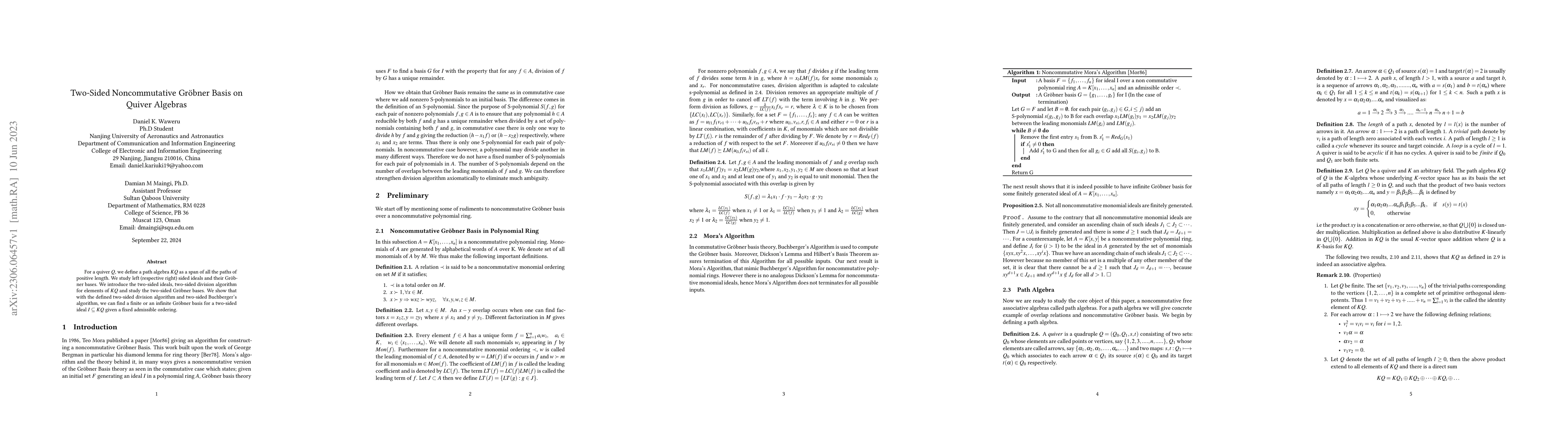 For a quiver $Q$, we define a path algebra $KQ$ as a span of all the paths of positive length. We study left (respective right) sided ideals and their Gr\"{o}bner bases. We introduce the two-sided ideals, two-sided division algorithm for elements of $KQ$ and study the two-sided Gr\"{o}bner bases. We show that with the defined two-sided division algorithm and two-sided Buchberger's algorithm, we can find a finite or an infinite Gr\"{o}bner basis for a two-sided ideal $I \subseteq KQ$ given a fixed admissible ordering.