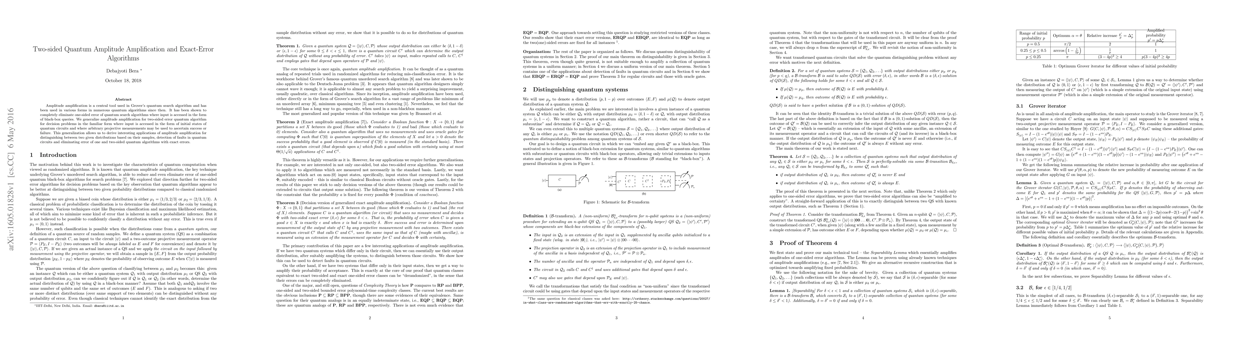 This paper generalizes amplitude amplification to two-sided error quantum algorithms, enabling applications in distinguishing distributions, detecting faults in quantum circuits, and eliminating errors in quantum algorithms with exact errors. The approach provides a versatile tool for quantum decision problems where input is accessed via quantum circuits and projective measurements.