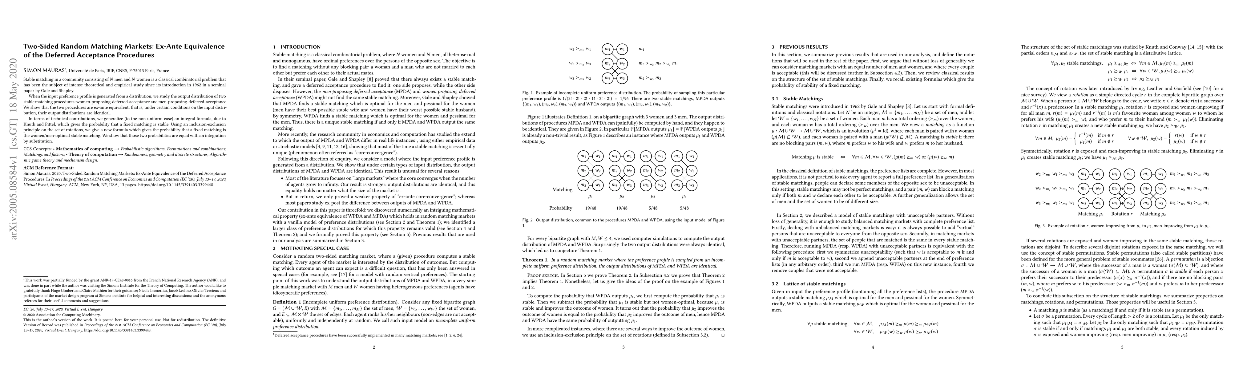 Researchers show that two stable matching procedures for women and men proposing in a dating market have identical output distributions under certain conditions, leading to ex-ante equivalence.