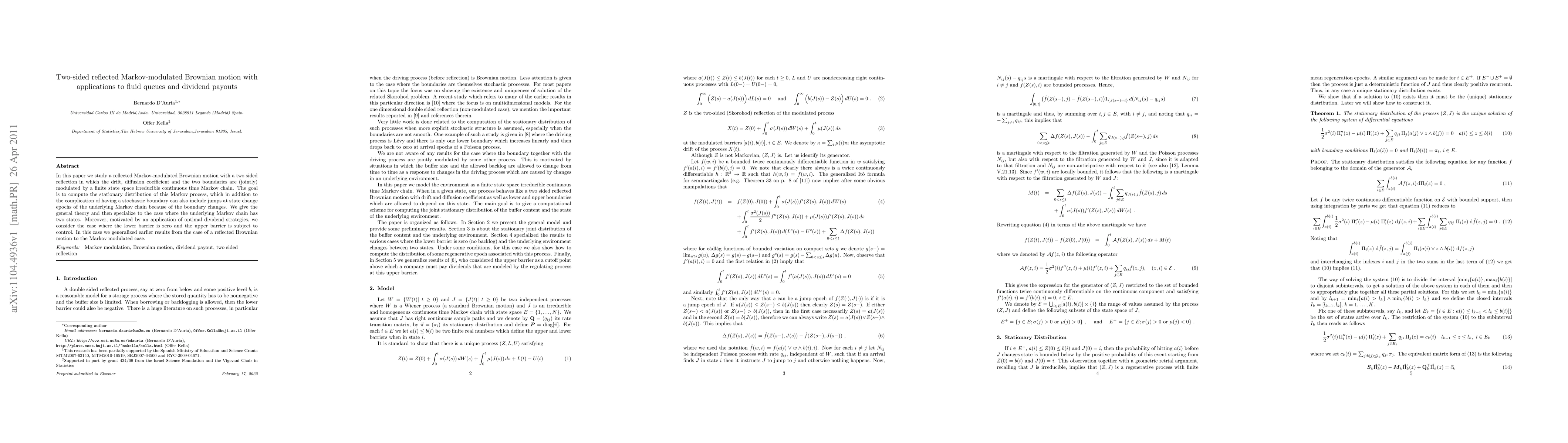 In this paper we study a reflected Markov-modulated Brownian motion with a two sided reflection in which the drift, diffusion coefficient and the two boundaries are (jointly) modulated by a finite state space irreducible continuous time Markov chain. The goal is to compute the stationary distribution of this Markov process, which in addition to the complication of having a stochastic boundary can also include jumps at state change epochs of the underlying Markov chain because of the boundary changes. We give the general theory and then specialize to the case where the underlying Markov chain has two states. Moreover, motivated by an application of optimal dividend strategies, we consider the case where the lower barrier is zero and the upper barrier is subject to control. In this case we generalized earlier results from the case of a reflected Brownian motion to the Markov modulated case.