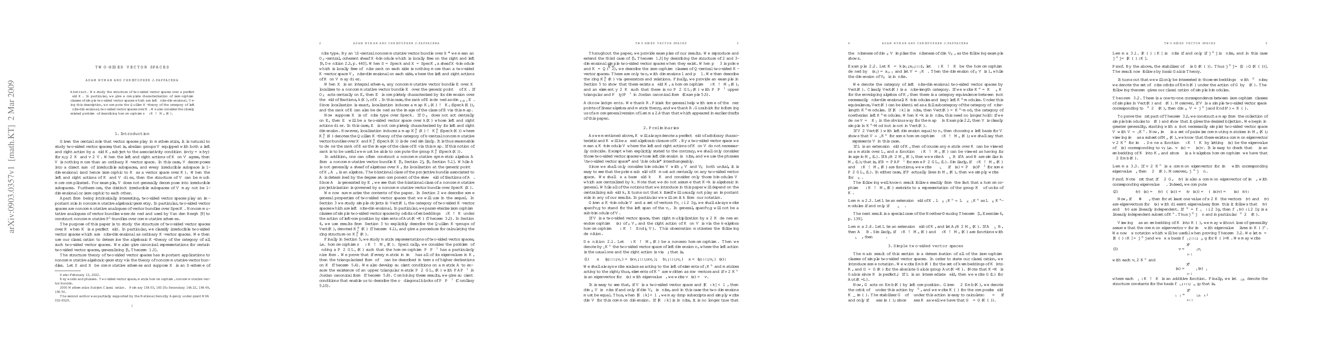 We study the structure of two-sided vector spaces over a perfect field $K$. In particular, we give a complete characterization of isomorphism classes of simple two-sided vector spaces which are left finite-dimensional. Using this description, we compute the Quillen $K$-theory of the category of left finite-dimensional, two-sided vector spaces over $K$. We also consider the closely related problem of describing homomorphisms $\phi:K\to M_n(K)$.