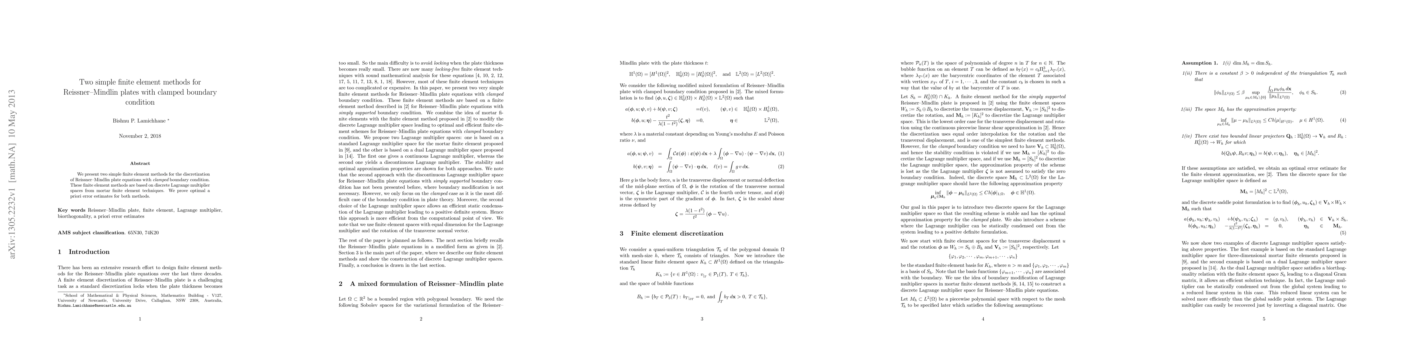 Summary: This paper introduces two straightforward finite element methods for solving Reissner-Mindlin plate equations with clamped boundary conditions, utilizing discrete Lagrange multipliers. The authors provide optimal a priori error estimates for both methods.