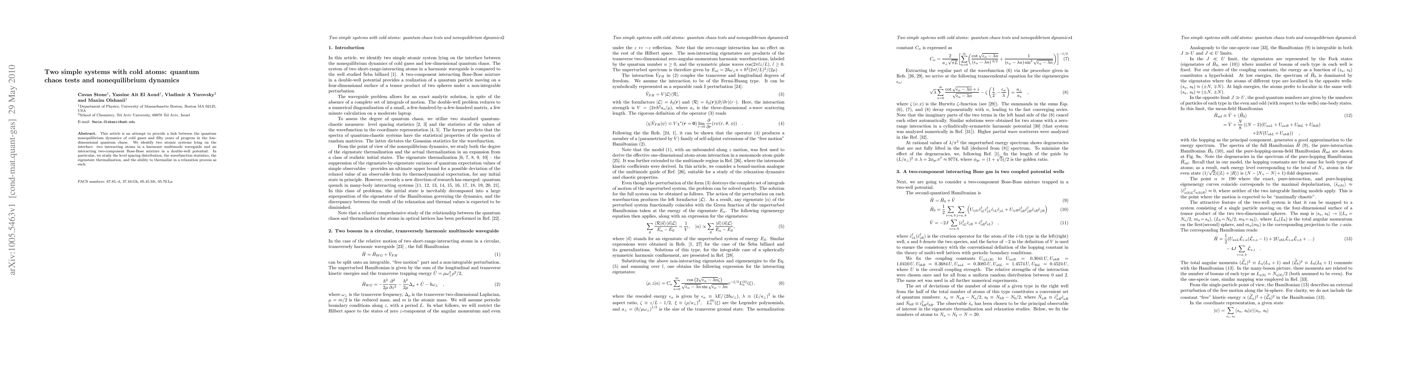 This article is an attempt to provide a link between the quantum nonequilibrium dynamics of cold gases and fifty years of progress in the lowdimensional quantum chaos. We identify two atomic systems lying on the interface: two interacting atoms in a harmonic multimode waveguide and an interacting two-component Bose-Bose mixture in a double-well potential. In particular, we study the level spacing distribution, the wavefunction statistics, the eigenstate thermalization, and the ability to thermalize in a relaxation process as such.