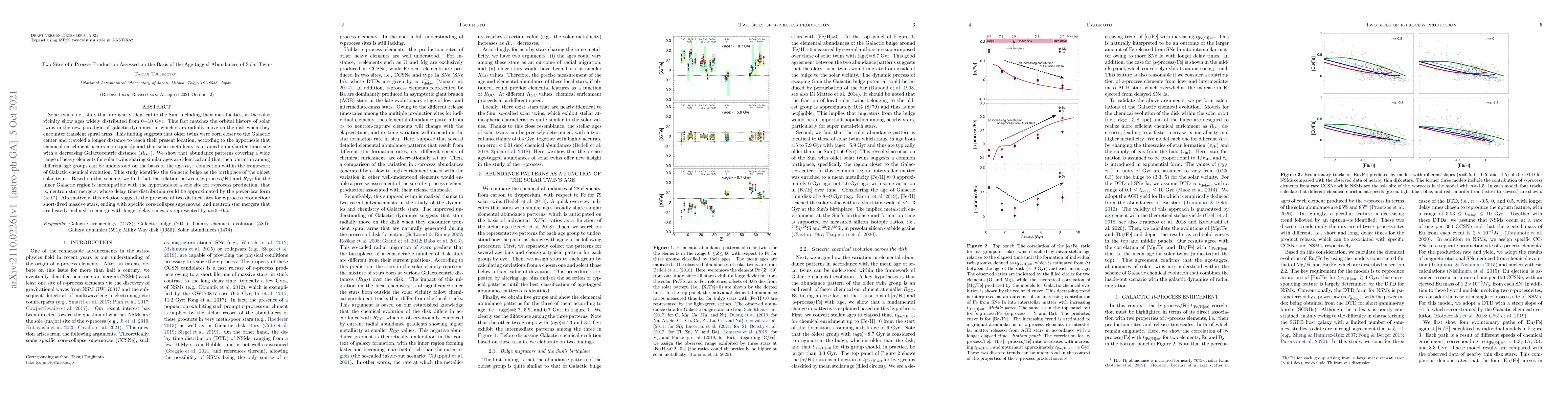 Solar twins, i.e., stars that are nearly identical to the Sun, including their metallicities, in the solar vicinity show ages widely distributed from 0-10 Gyr. This fact matches the orbital history of solar twins in the new paradigm of galactic dynamics, in which stars radially move on the disk when they encounter transient spiral arms. This finding suggests that older twins were born closer to the Galactic center and traveled a longer distance to reach their present location, according to the hypothesis that chemical enrichment occurs more quickly and that solar metallicity is attained on a shorter timescale with a decreasing Galactocentric distance (R_GC). We show that abundance patterns covering a wide range of heavy elements for solar twins sharing similar ages are identical and that their variation among different age groups can be understood on the basis of the age-R_GC connection within the framework of Galactic chemical evolution. This study identifies the Galactic bulge as the birthplace of the oldest solar twins. Based on this scheme, we find that the relation between [r-process/Fe] and R_GC for the inner Galactic region is incompatible with the hypothesis of a sole site for r-process production, that is, neutron star mergers, whose delay time distribution could be approximated by the power-law form (proportional to t^n). Alternatively, this relation suggests the presence of two distinct sites for r-process production: short-lived massive stars, ending with specific core-collapse supernovae, and neutron star mergers that are heavily inclined to emerge with longer delay times, as represented by n=0-0.5.