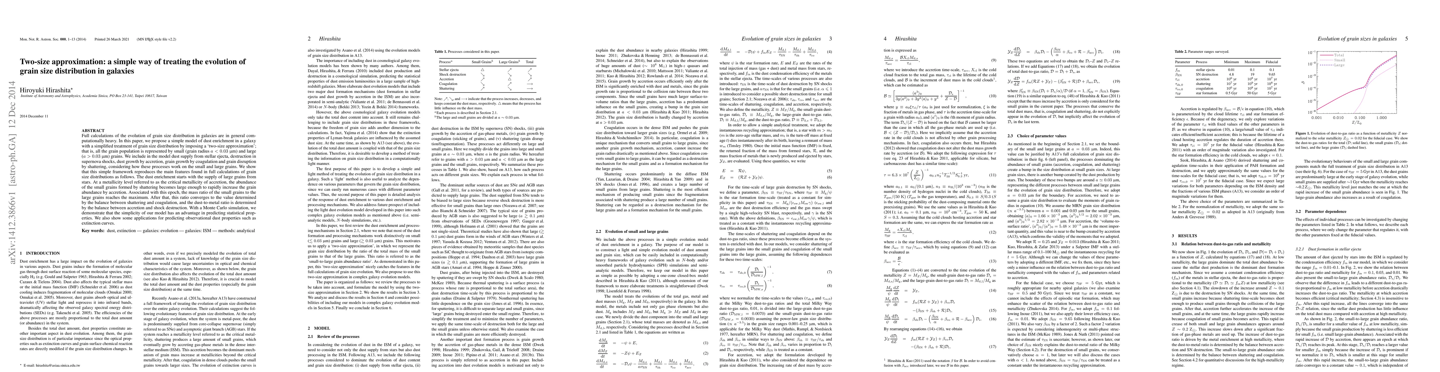 This paper proposes a simplified "two-size approximation" model to computationally efficiently study the evolution of grain size distribution in galaxies, representing grains as small (< 0.03 micron) and large (> 0.03 micron). The model captures key processes like dust supply, destruction, growth, and disruption, and demonstrates its effectiveness in predicting statistical properties and observational dust properties.