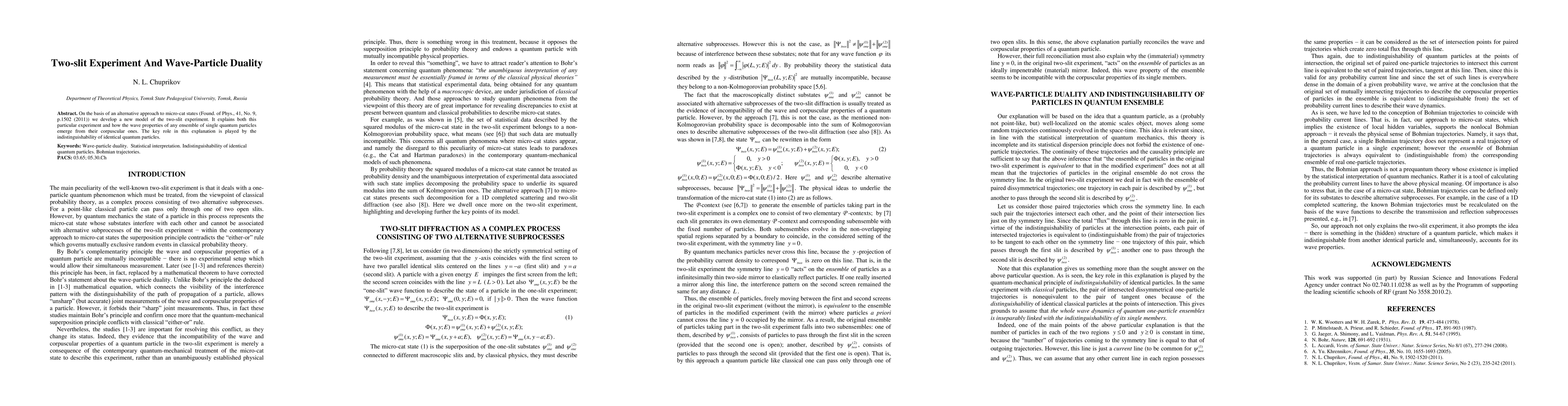 A new model explains how quantum particles' wave properties emerge from their corpuscular nature, highlighting the key role of indistinguishability among identical particles in the two-slit experiment.