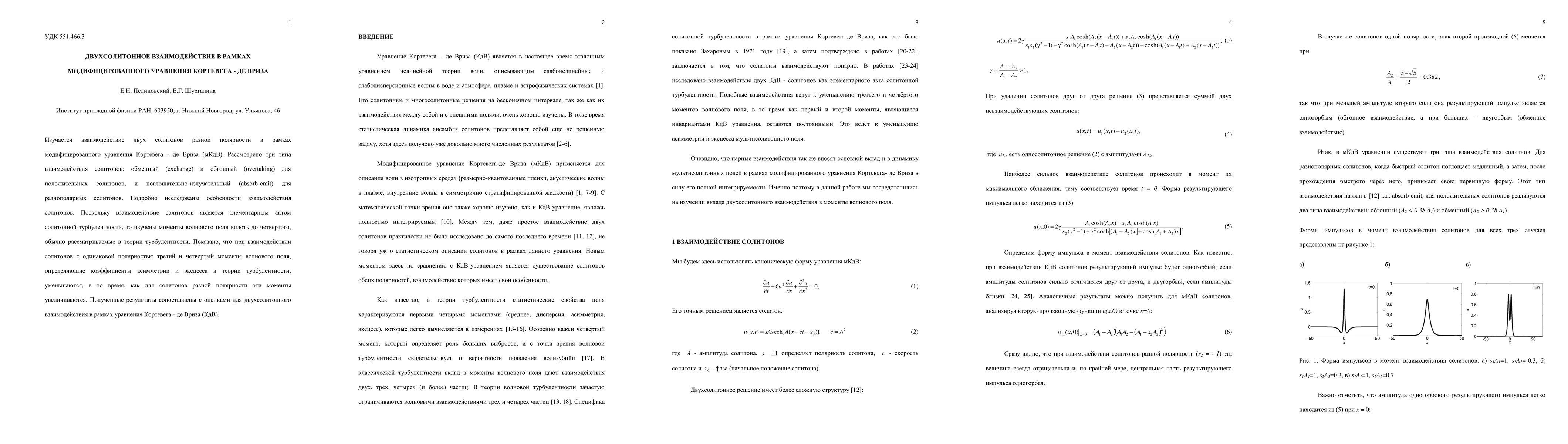 Interaction of two solitons of the different polarities in the framework of modified Korteweg-de Vries (mKdV) equation is studied. Three types of soliton interaction are considered: exchange and overtaking for solitons of the same polarity, and absorb-emit for solitons of different polarity. Features of soliton interaction are studied in details. Since the interaction of solitons is an elementary act of soliton turbulence, the moments of the wave field up to fourth are studied, which are usually considered in the turbulence theory. It is shown that in the case of interaction of solitons of the same polarity the third and fourth moments of the wave field, which determine the coefficients of skewness and kurtosis in the theory of turbulence, are reduced, while in the case of interaction of solitons of different polarity these moments are increased. The results are compared with the estimations for the two-soliton interaction in the framework of the Korteweg - de Vries (KdV) equation.