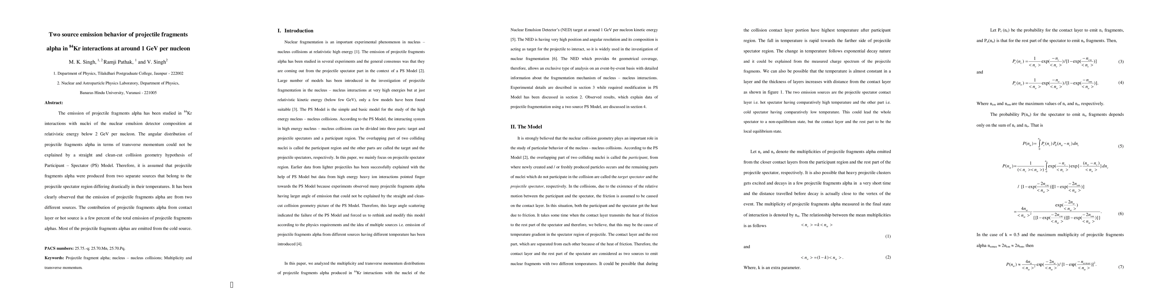 The emission of projectile fragments alpha has been studied in 84^Kr interactions with nuclei of the nuclear emulsion detector composition at relativistic energy below 2 GeV per nucleon. The angular distribution of projectile fragments alpha in terms of transverse momentum could not be explained by a straight and clean-cut collision geometry hypothesis of Participant - Spectator (PS) Model. Therefore, it is assumed that projectile fragments alpha were produced from two separate sources that belong to the projectile spectator region differing drastically in their temperatures. It has been clearly observed that the emission of projectile fragments alpha are from two different sources. The contribution of projectile fragments alpha from contact layer or hot source is a few percent of the total emission of projectile fragments alphas. Most of the projectile fragments alphas are emitted from the cold source.