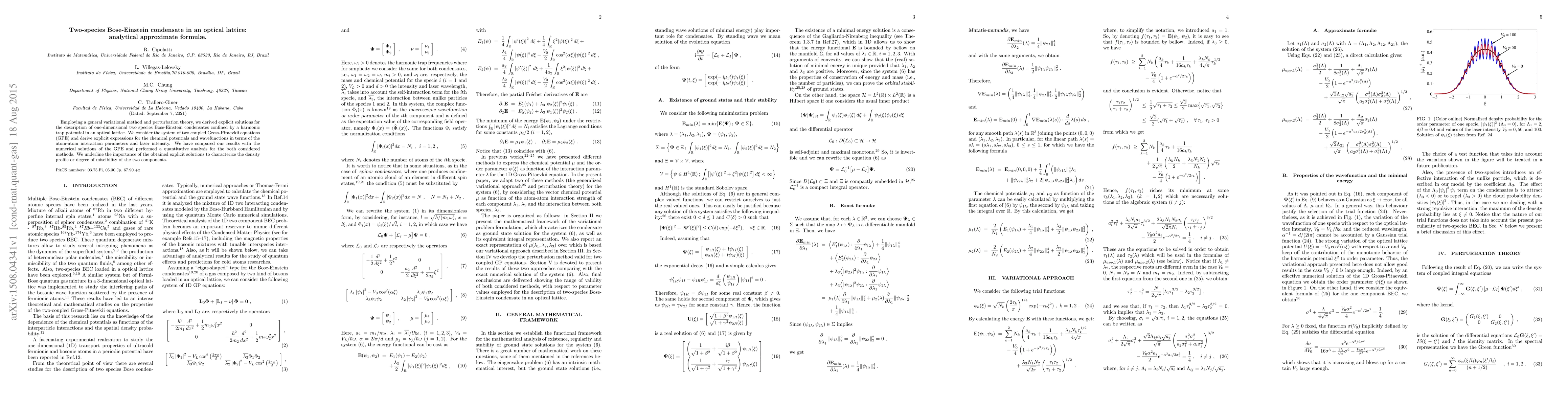 Employing a general variational method and perturbation theory, we derived explicit solutions for the description of one-dimensional two species Bose-Einstein condensates confined by a harmonic trap potential in an optical lattice. We consider the system of two coupled Gross-Pitaevkii equations (GPE) and derive explicit expressions for the chemical potentials and wavefunctions in terms of the atom-atom interaction parameters and laser intensity. We have compared our results with the numerical solutions of the GPE and performed a quantitative analysis for the both considered methods. We underline the importance of the obtained explicit solutions to characterize the density profile or degree of miscibility of the two components.