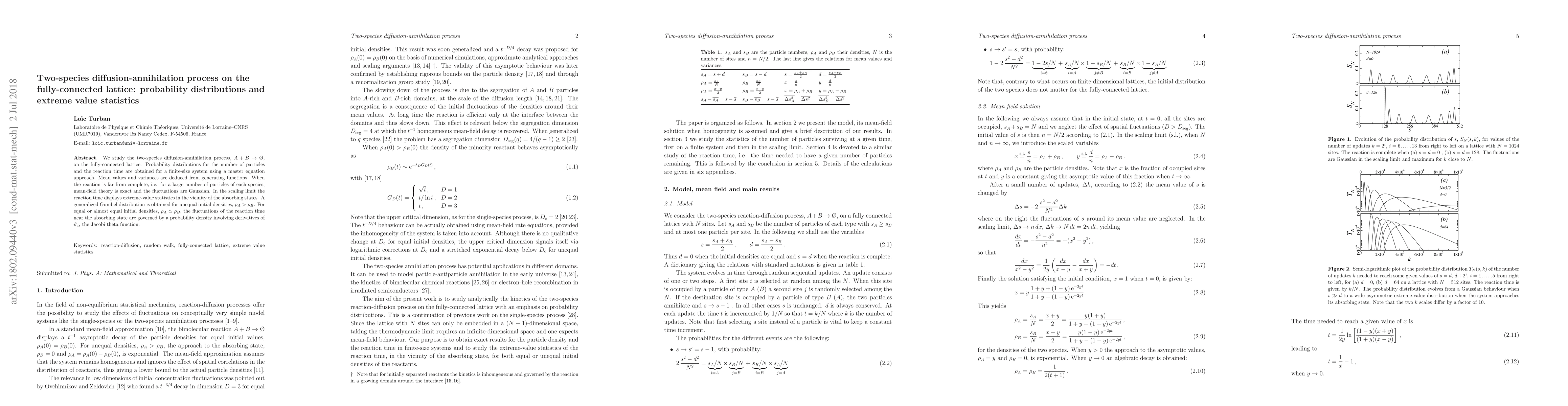 We study the two-species diffusion-annihilation process, $A+B\rightarrow$ \O, on the fully-connected lattice. Probability distributions for the number of particles and the reaction time are obtained for a finite-size system using a master equation approach. Mean values and variances are deduced from generating functions. When the reaction is far from complete, i.e., for a large number of particles of each species, mean-field theory is exact and the fluctuations are Gaussian. In the scaling limit the reaction time displays extreme-value statistics in the vicinity of the absorbing states. A generalized Gumbel distribution is obtained for unequal initial densities, $\rho_A>\rho_B$. For equal or almost equal initial densities, $\rho_A\simeq\rho_B$, the fluctuations of the reaction time near the absorbing state are governed by a probability density involving derivatives of $\vartheta_4$, the Jacobi theta function.