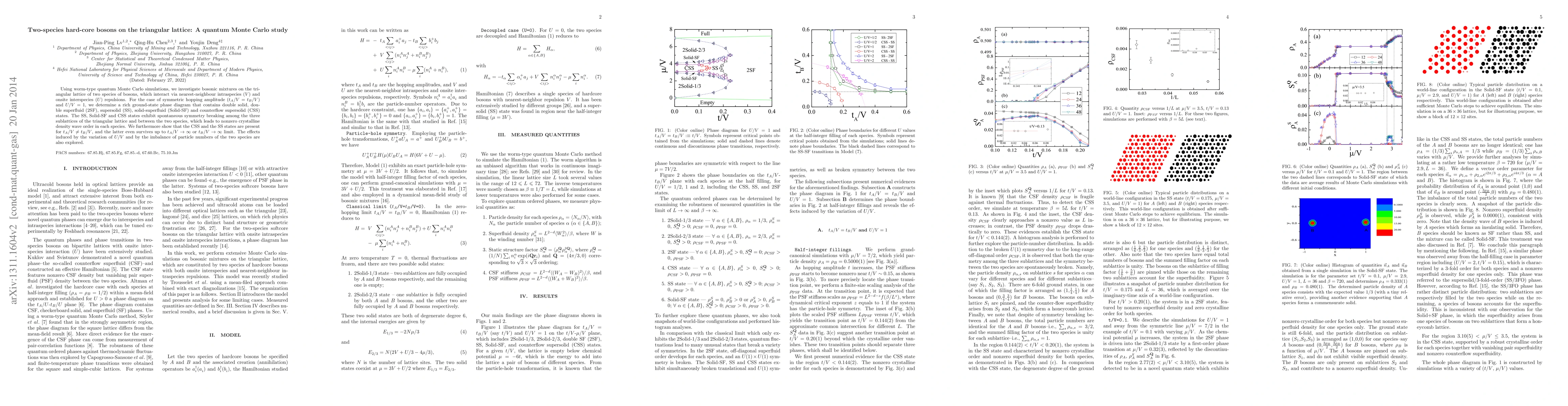This study uses quantum Monte Carlo simulations to explore the ground-state phase diagram of two-species hard-core bosons on a triangular lattice, revealing diverse phases including double solid, double superfluid, supersolid, and counterflow supersolid states. The research highlights spontaneous symmetry breaking and density wave order in certain phases, and examines the effects of varying interaction strengths and particle number imbalance.
