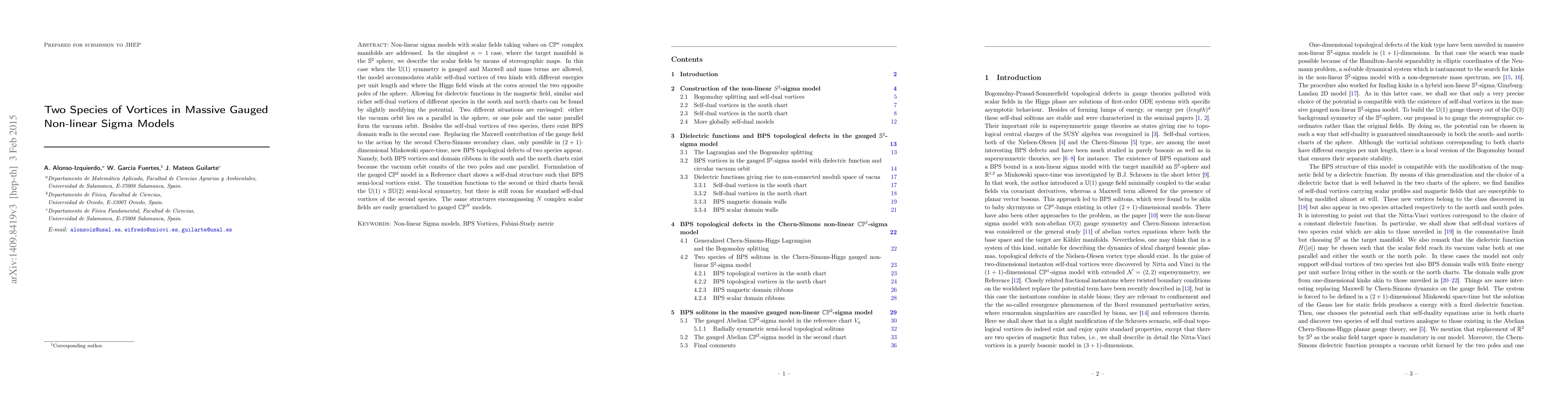 Non-linear sigma models with scalar fields taking values on $\mathbb{C}\mathbb{P}^n$ complex manifolds are addressed. In the simplest $n=1$ case, where the target manifold is the $\mathbb{S}^2$ sphere, we describe the scalar fields by means of stereographic maps. In this case when the $\mathbb{U}(1)$ symmetry is gauged and Maxwell and mass terms are allowed, the model accommodates stable self-dual vortices of two kinds with different energies per unit length and where the Higgs field winds at the cores around the two opposite poles of the sphere. Allowing for dielectric functions in the magnetic field, similar and richer self-dual vortices of different species in the south and north charts can be found by slightly modifying the potential. Two different situations are envisaged: either the vacuum orbit lies on a parallel in the sphere, or one pole and the same parallel form the vacuum orbit. Besides the self-dual vortices of two species, there exist BPS domain walls in the second case. Replacing the Maxwell contribution of the gauge field to the action by the second Chern-Simons secondary class, only possible in $(2+1)$-dimensional Minkowski space-time, new BPS topological defects of two species appear. Namely, both BPS vortices and domain ribbons in the south and the north charts exist because the vacuum orbit consits of the two poles and one parallel. Formulation of the gauged $\mathbb{C}\mathbb{P}^2$ model in a Reference chart shows a self-dual structure such that BPS semi-local vortices exist. The transition functions to the second or third charts break the $\mathbb{U}(1)\times\mathbb{S}\mathbb{U}(2)$ semi-local symmetry, but there is still room for standard self-dual vortices of the second species. The same structures encompassing $N$ complex scalar fields are easily generalized to gauged $\mathbb{C}\mathbb{P}^N$ models.