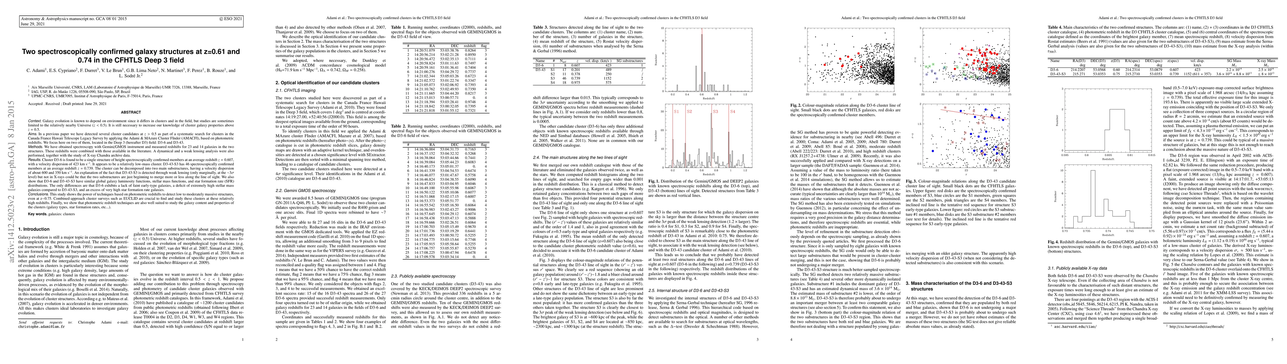 Adami et al. (2010) have detected several cluster candidates at z>0.5 as part of a systematic search for clusters in the Canada France Hawaii Telescope Legacy Survey, based on photometric redshifts. We focus here on two of them, located in the D3 field: D3-6 and D3-43. We have obtained spectroscopy with Gemini/GMOS and measured redshifts for 23 and 14 galaxies in the two structures. These redshifts were combined with those available in the literature. A dynamical and a weak lensing analysis were also performed, together with the study of X-ray Chandra archive data. Cluster D3-6 is found to be a single structure of 8 spectroscopically confirmed members at an average redshift z=0.607, with a velocity dispersion of 423 km/s. It appears to be a relatively low mass cluster. D3-43-S3 has 46 spectroscopically confirmed members at an average redshift z=0.739. It can be decomposed into two main substructures, having a velocity dispersion of about 600 and 350 km/s. An explanation to the fact that D3-43-S3 is detected through weak lensing (only marginally, at the ~3sigma level) but not in X-rays could be that the two substructures are just beginning to merge more or less along the line of sight. We also show that D3-6 and D3-43-S3 have similar global galaxy luminosity functions, stellar mass functions, and star formation rate (SFR) distributions. The only differences are that D3-6 exhibits a lack of faint early type galaxies, a deficit of extremely high stellar mass galaxies compared to D3-43-S3, and an excess of very high SFR galaxies. This study shows the power of techniques based on photometric redshifts to detect low to moderately massive structures, even at z~0.75.