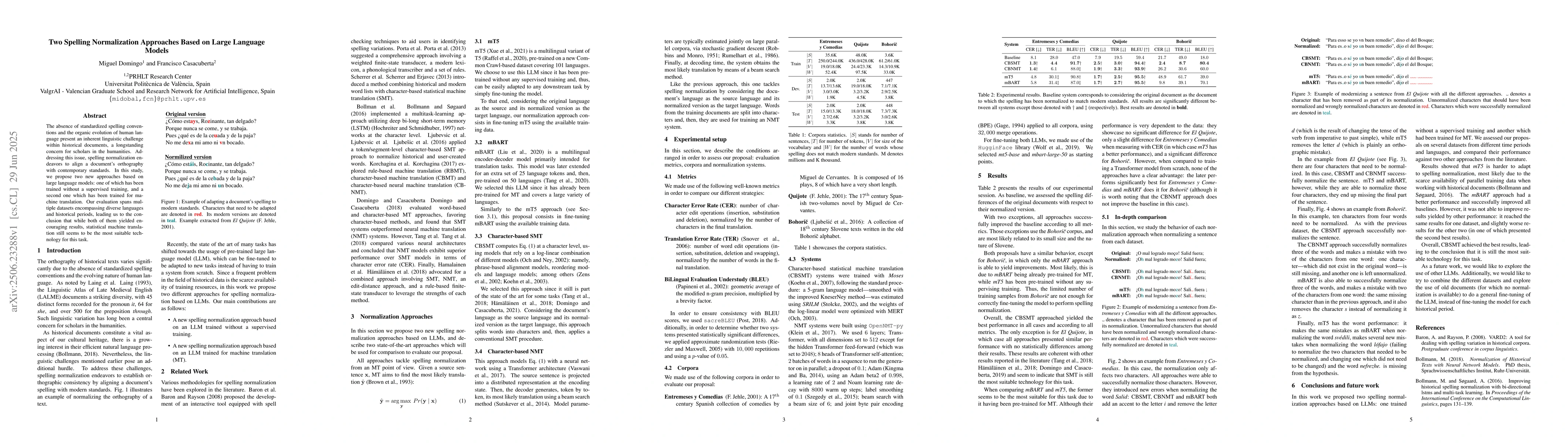 This research proposes two spelling normalization approaches using large language models, one unsupervised and another trained for machine translation. Evaluation across various datasets indicates that while both performed well, statistical machine translation remains the most effective method for spelling normalization in historical documents.