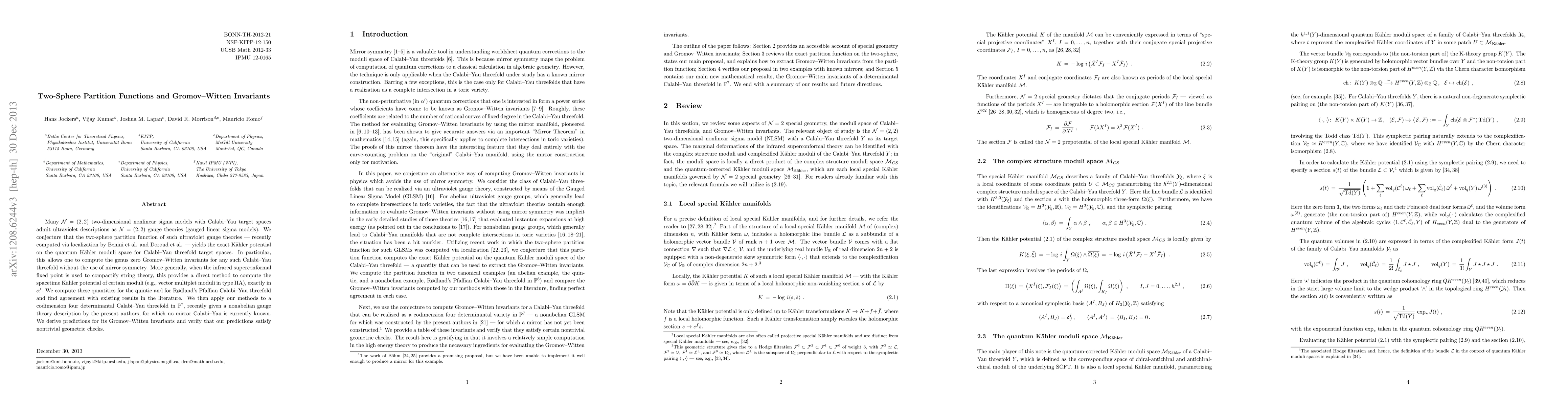 Many N=(2,2) two-dimensional nonlinear sigma models with Calabi-Yau target spaces admit ultraviolet descriptions as N=(2,2) gauge theories (gauged linear sigma models). We conjecture that the two-sphere partition function of such ultraviolet gauge theories -- recently computed via localization by Benini et al. and Doroud et al. -- yields the exact K\"ahler potential on the quantum K\"ahler moduli space for Calabi-Yau threefold target spaces. In particular, this allows one to compute the genus zero Gromov-Witten invariants for any such Calabi-Yau threefold without the use of mirror symmetry. More generally, when the infrared superconformal fixed point is used to compactify string theory, this provides a direct method to compute the spacetime K\"ahler potential of certain moduli (e.g., vector multiplet moduli in type IIA), exactly in {\alpha}'. We compute these quantities for the quintic and for R{\o}dland's Pfaffian Calabi-Yau threefold and find agreement with existing results in the literature. We then apply our methods to a codimension four determinantal Calabi-Yau threefold in P^7, recently given a nonabelian gauge theory description by the present authors, for which no mirror Calabi-Yau is currently known. We derive predictions for its Gromov-Witten invariants and verify that our predictions satisfy nontrivial geometric checks.