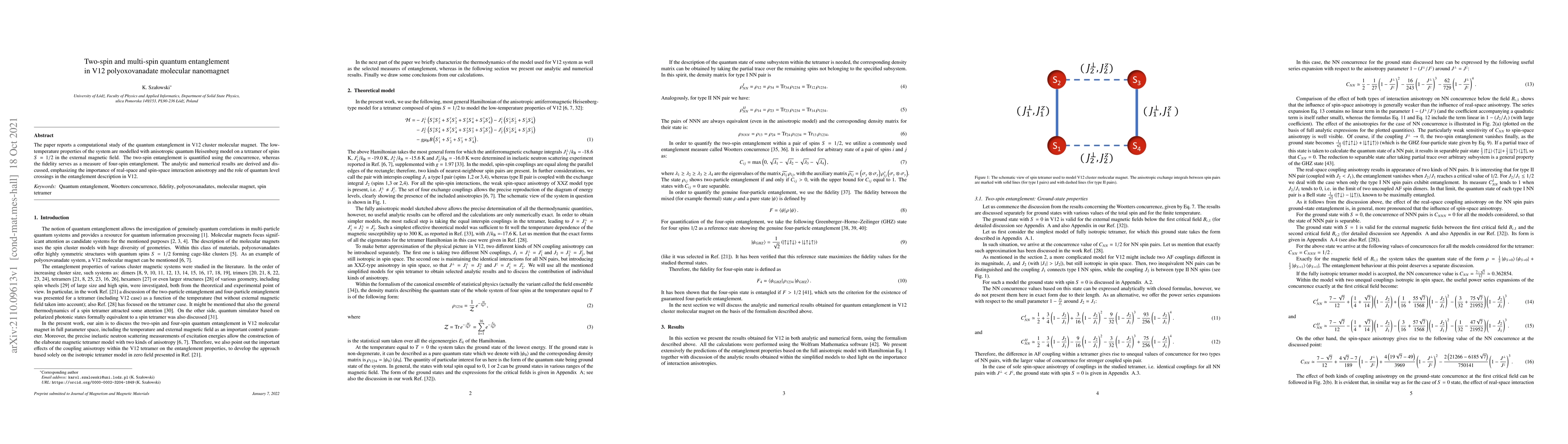 The paper reports a computational study of the quantum entanglement in V12 cluster molecular magnet. The low-temperature properties of the system are modelled with anisotropic quantum Heisenberg model on a tetramer of spins $S=1/2$ in the external magnetic field. The two-spin entanglement is quantified using the concurrence, whereas the fidelity serves as a measure of four-spin entanglement. The analytic and numerical results are derived and discussed, emphasizing the importance of real-space and spin-space interaction anisotropy and the role of quantum level crossings in the entanglement description in V12.