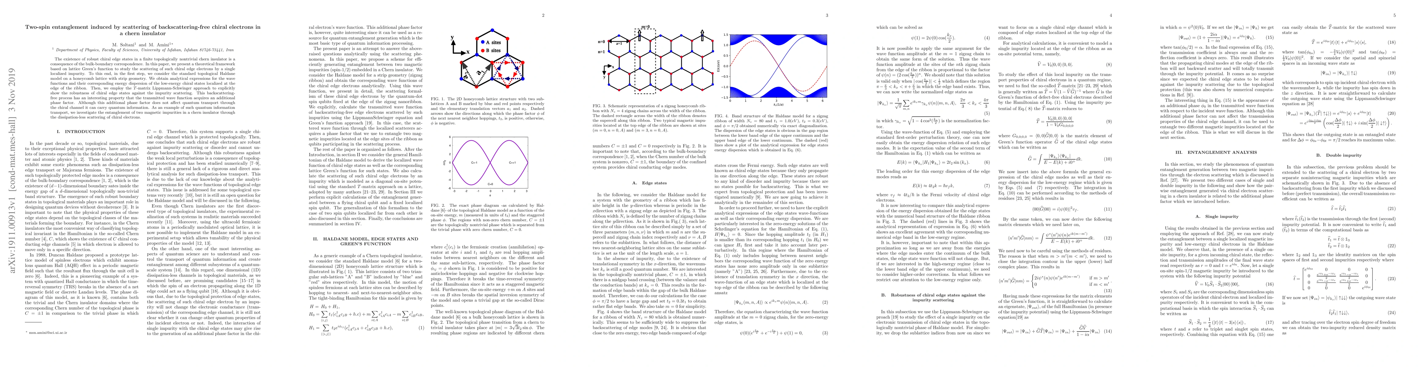 The existence of robust chiral edge states in a finite topologically nontrivial chern insulator is a consequence of the bulk-boundary correspondence. In this paper, we present a theoretical framework based on lattice Green's function to study the scattering of such chiral edge electrons by a single localized impurity. To this end, in the first step, we consider the standard topological Haldane model on a honeycomb lattice with strip geometry. We obtain analytical expressions for the wave functions and their corresponding energy dispersion of the low-energy chiral states localized at the edge of the ribbon. Then, we employ the $T$-matrix Lippmann-Schwinger approach to explicitly show the robustness of chiral edge states against the impurity scattering. This backscattering-free process has an interesting property that the transmitted wave function acquires an additional phase factor. Although this additional phase factor does not affect quantum transport through the chiral channel it can carry quantum information. As an example of such quantum information transport, we investigate the entanglement of two magnetic impurities in a chern insulator through the dissipation-less scattering of chiral electrons.