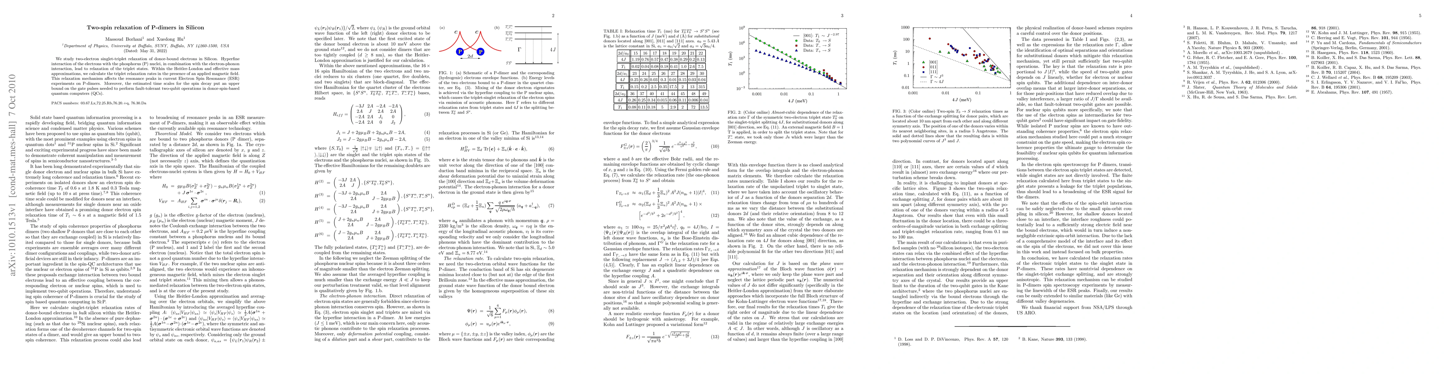 The paper presents a detailed theoretical framework for calculating two-spin relaxation rates in P-dimers, incorporating both hyperfine and electron-phonon interactions.