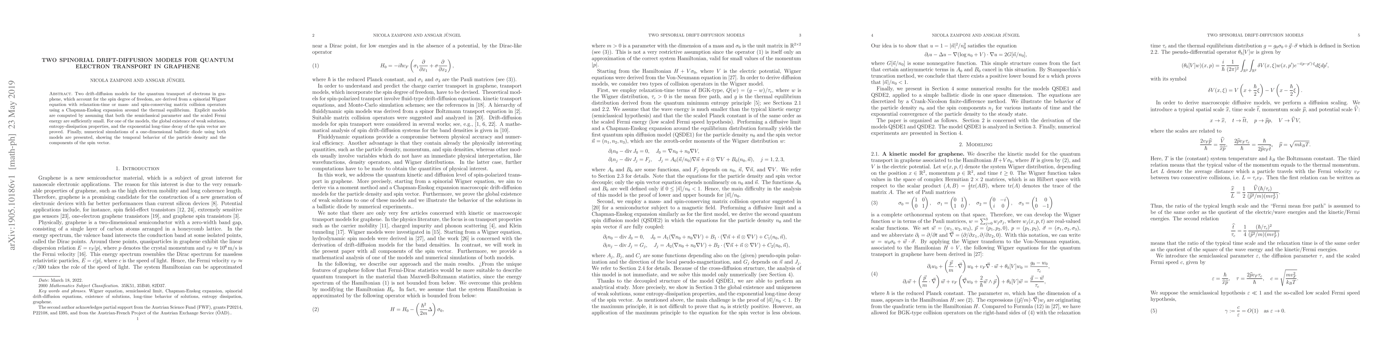 Two drift-diffusion models for the quantum transport of electrons in graphene, which account for the spin degree of freedom, are derived from a spinorial Wigner equation with relaxation-time or mass- and spin-conserving matrix collision operators using a Chapman-Enskog expansion around the thermal equilibrium. Explicit models are computed by assuming that both the semiclassical parameter and the scaled Fermi energy are sufficiently small. For one of the models, the global existence of weak solutions, entropy-dissipation properties, and the exponential long-time decay of the spin vector are proved. Finally, numerical simulations of a one-dimensional ballistic diode using both models are presented, showing the temporal behavior of the particle density and the components of the spin vector.