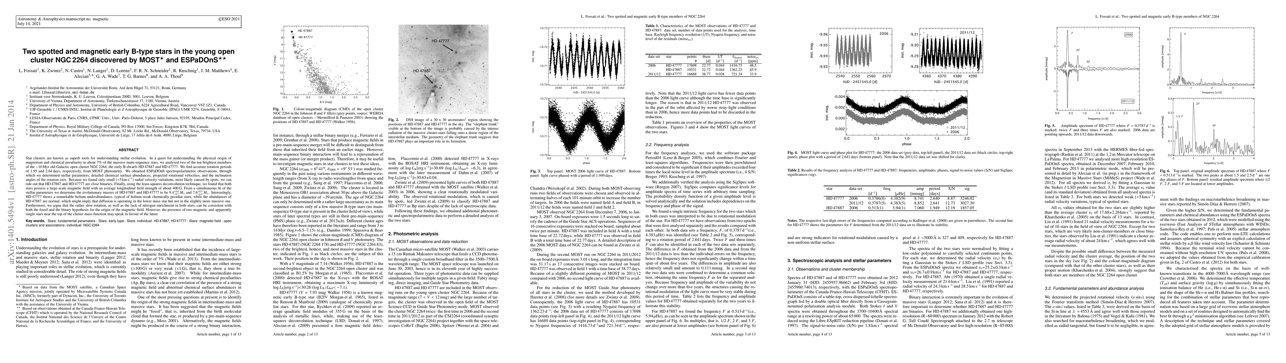 Star clusters are known as superb tools for understanding stellar evolution. In a quest for understanding the physical origin of magnetism and chemical peculiarity in about 7% of the massive main-sequence stars, we analysed two of the ten brightest members of the ~10 Myr old Galactic open cluster NGC 2264, the early B-dwarfs HD47887 and HD47777. We find accurate rotation periods of 1.95 and 2.64 days, respectively, from MOST photometry. We obtained ESPaDOnS spectropolarimetric observations, through which we determined stellar parameters, detailed chemical surface abundances, projected rotational velocities, and the inclination angles of the rotation axis. Because we found only small (<5 km/s) radial velocity variations, most likely caused by spots, we can rule out that HD47887 and HD47777 are close binaries. Finally, using the least-squares deconvolution technique, we found that both stars possess a large-scale magnetic field with an average longitudinal field strength of about 400 G. From a simultaneous fit of the stellar parameters we determine the evolutionary masses of HD47887 and HD47777 to be 9.4+/-0.7 M0 and 7.6+/-0.5 M0. Interestingly, HD47777 shows a remarkable helium underabundance, typical of helium-weak chemically peculiar stars, while the abundances of HD47887 are normal, which might imply that diffusion is operating in the lower mass star but not in the slightly more massive one. Furthermore, we argue that the rather slow rotation, as well as the lack of nitrogen enrichment in both stars, can be consistent with both the fossil and the binary hypothesis for the origin of the magnetic field. However, the presence of two magnetic and apparently single stars near the top of the cluster mass-function may speak in favour of the latter.