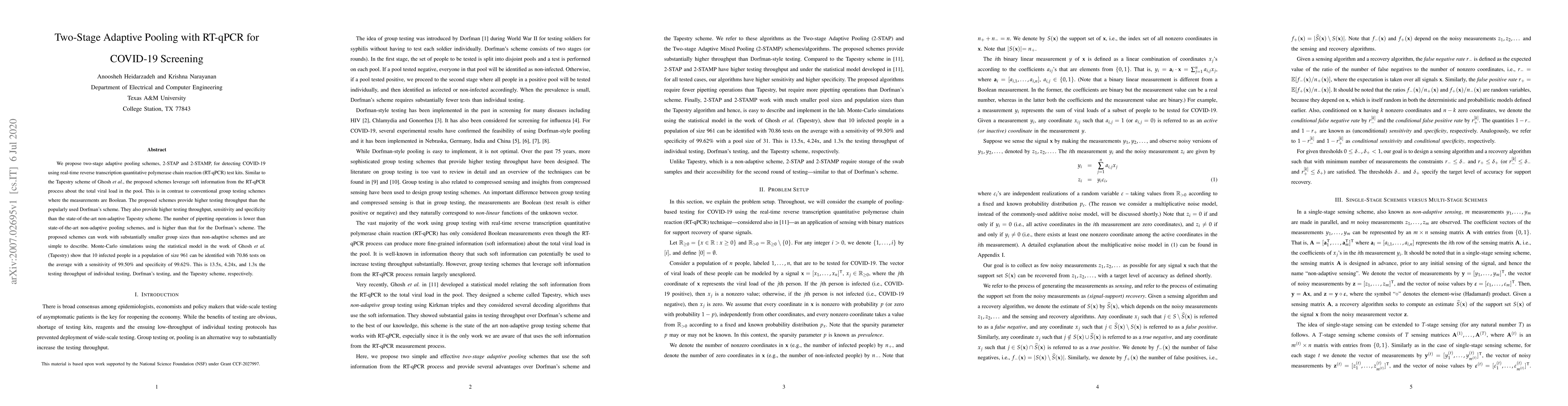 Two-stage adaptive pooling schemes for COVID-19 screening offer higher testing throughput, sensitivity, and specificity than traditional methods, enabling the detection of 10 infected individuals with fewer tests.