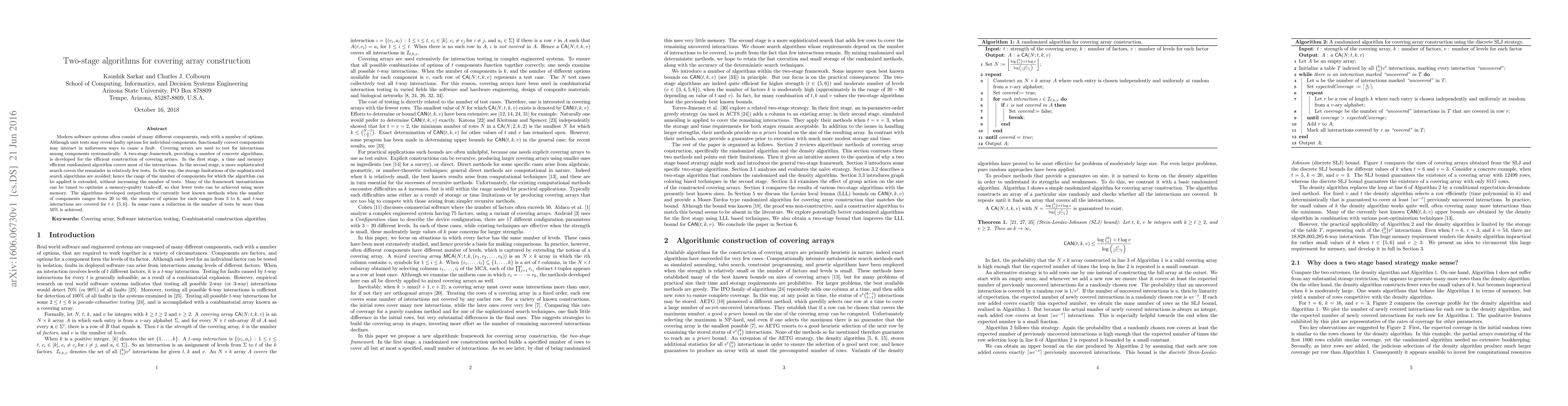 Modern software systems often consist of many different components, each with a number of options. Although unit tests may reveal faulty options for individual components, functionally correct components may interact in unforeseen ways to cause a fault. Covering arrays are used to test for interactions among components systematically. A two-stage framework, providing a number of concrete algorithms, is developed for the efficient construction of covering arrays. %Our framework divides the construction in two stages. In the first stage, a time and memory efficient randomized algorithm covers most of the interactions. In the second stage, a more sophisticated search covers the remainder in relatively few tests. In this way, the storage limitations of the sophisticated search algorithms are avoided; hence the range of the number of components for which the algorithm can be applied is extended, without increasing the number of tests. Many of the framework instantiations can be tuned to optimize a memory-quality trade-off, so that fewer tests can be achieved using more memory. The algorithms developed outperform the currently best known methods when the number of components ranges from 20 to 60, the number of options for each ranges from 3 to 6, and $t$-way interactions are covered for $t\in \{5,6\}$. In some cases a reduction in the number of tests by more than $50\%$ is achieved.