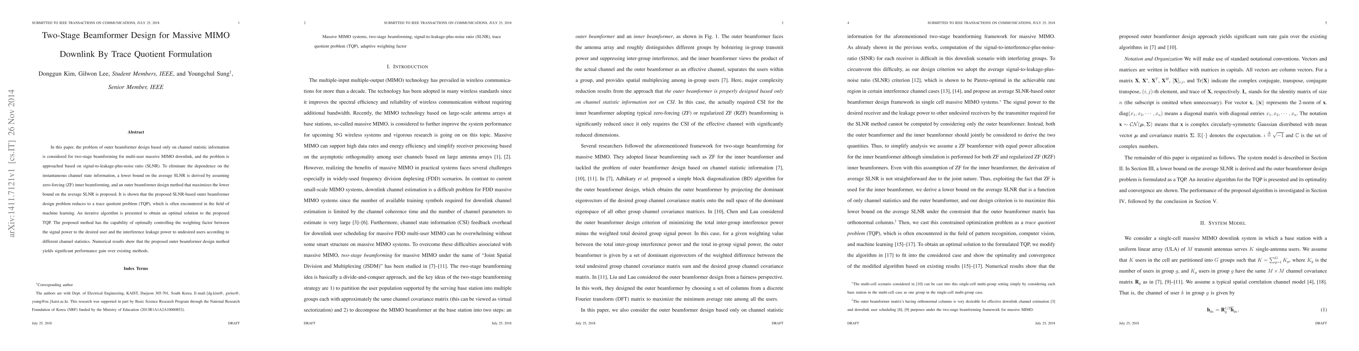 This paper proposes a two-stage beamforming design for massive MIMO downlink using a Trace Quotient Formulation (TQP). It derives a lower bound on the average Signal-to-Leakage-plus-Noise Ratio (SLNR) based on channel statistics, eliminating dependence on instantaneous channel state information. An iterative algorithm is presented to solve the resulting TQP, offering significant performance improvement over existing methods in controlling signal power to desired users and interference leakage to undesired users.