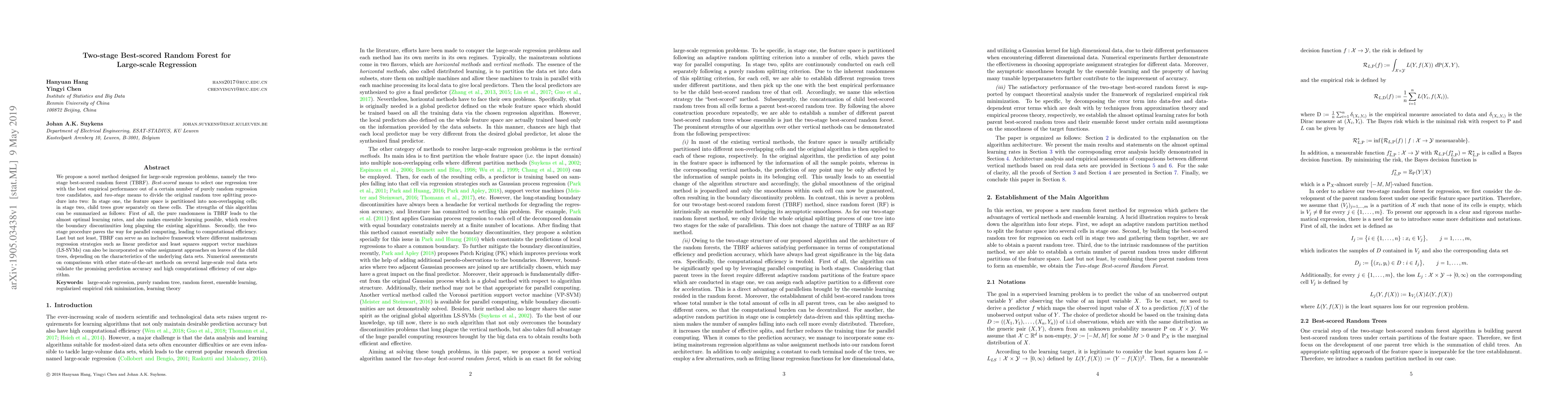 The paper introduces the two-stage best-scored random forest (TBRF) for large-scale regression, which selects the best random regression tree and divides tree splitting into two stages for parallel computing. TBRF demonstrates optimal learning rates, computational efficiency, and flexibility to incorporate various regression strategies.