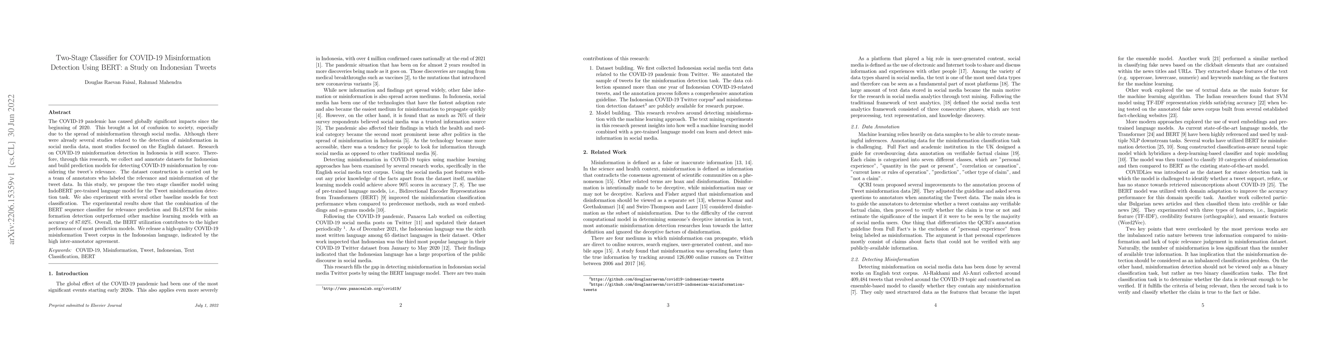 The COVID-19 pandemic has caused globally significant impacts since the beginning of 2020. This brought a lot of confusion to society, especially due to the spread of misinformation through social media. Although there were already several studies related to the detection of misinformation in social media data, most studies focused on the English dataset. Research on COVID-19 misinformation detection in Indonesia is still scarce. Therefore, through this research, we collect and annotate datasets for Indonesian and build prediction models for detecting COVID-19 misinformation by considering the tweet's relevance. The dataset construction is carried out by a team of annotators who labeled the relevance and misinformation of the tweet data. In this study, we propose the two-stage classifier model using IndoBERT pre-trained language model for the Tweet misinformation detection task. We also experiment with several other baseline models for text classification. The experimental results show that the combination of the BERT sequence classifier for relevance prediction and Bi-LSTM for misinformation detection outperformed other machine learning models with an accuracy of 87.02%. Overall, the BERT utilization contributes to the higher performance of most prediction models. We release a high-quality COVID-19 misinformation Tweet corpus in the Indonesian language, indicated by the high inter-annotator agreement.