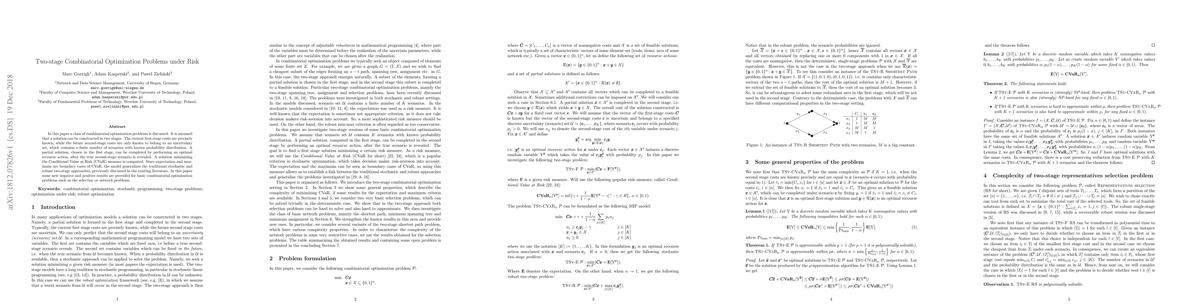 In this paper a class of combinatorial optimization problems is discussed. It is assumed that a solution can be constructed in two stages. The current first-stage costs are precisely known, while the future second-stage costs are only known to belong to an uncertainty set, which contains a finite number of scenarios with known probability distribution. A partial solution, chosen in the first stage, can be completed by performing an optimal recourse action, after the true second-stage scenario is revealed. A solution minimizing the Conditional Value at Risk (CVaR) measure is computed. Since expectation and maximum are boundary cases of CVaR, the model generalizes the traditional stochastic and robust two-stage approaches, previously discussed in the existing literature. In this paper some new negative and positive results are provided for basic combinatorial optimization problems such as the selection or network problems.