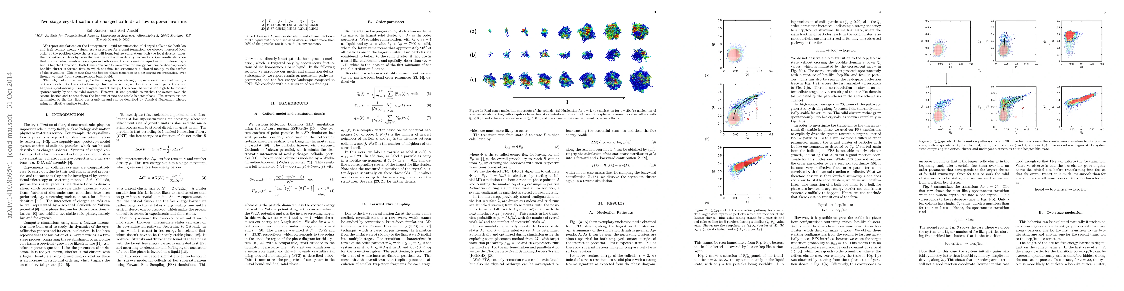 We report simulations on the homogeneous liquid-fcc nucleation of charged colloids for both low and high contact energy values. As a precursor for crystal formation, we observe increased local order at the position where the crystal will form, but no correlations with the local density. Thus, the nucleation is driven by order fluctuations rather than density fluctuations. Our results also show that the transition involves two stages in both cases, first a transition liquid-bcc, followed by a bcc-hcp/fcc transition. Both transitions have to overcome free energy barriers, so that a spherical bcc-like cluster is formed first, in which the final fcc-like structure is nucleated mainly at the surface of the crystallite. This means that the bcc-fcc phase transition is a heterogeneous nucleation, even though we start from a homogeneous bulk liquid. The height of the bcc-hcp/fcc free energy barrier strongly depends on the contact energies of the colloids. For low contact energy this barrier is low, so that the bcc-hcp/fcc transition happens spontaneously. For the higher contact energy, the second barrier is too high to be crossed spontaneously by the colloidal system. However, it was possible to ratchet the system over the second barrier and to transform the bcc nuclei into the stable hcp/fcc phase. The transitions are dominated by the first liquid-bcc transition and can be described by Classical Nucleation Theory using an effective surface tension.