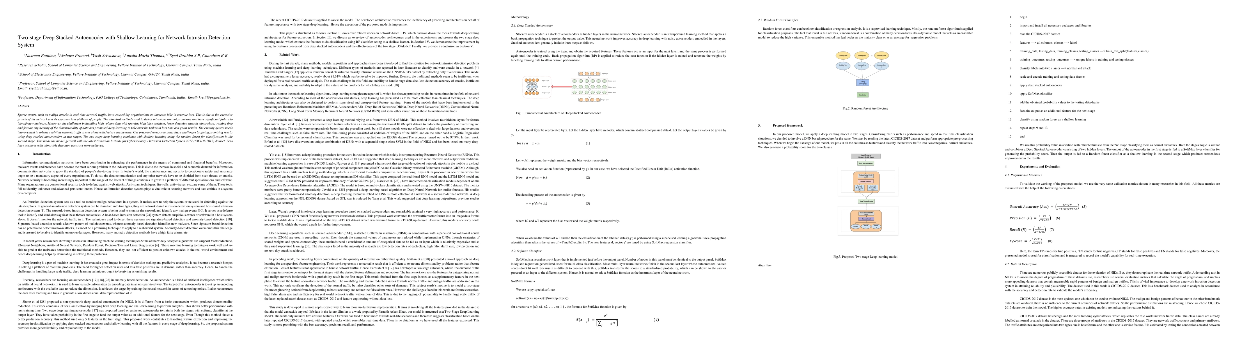 This paper proposes a two-stage deep stacked autoencoder with shallow learning for network intrusion detection, addressing challenges like high volume data sparsity and false positives. The model achieves zero false positives and high detection accuracy on the CICIDS-2017 dataset.
