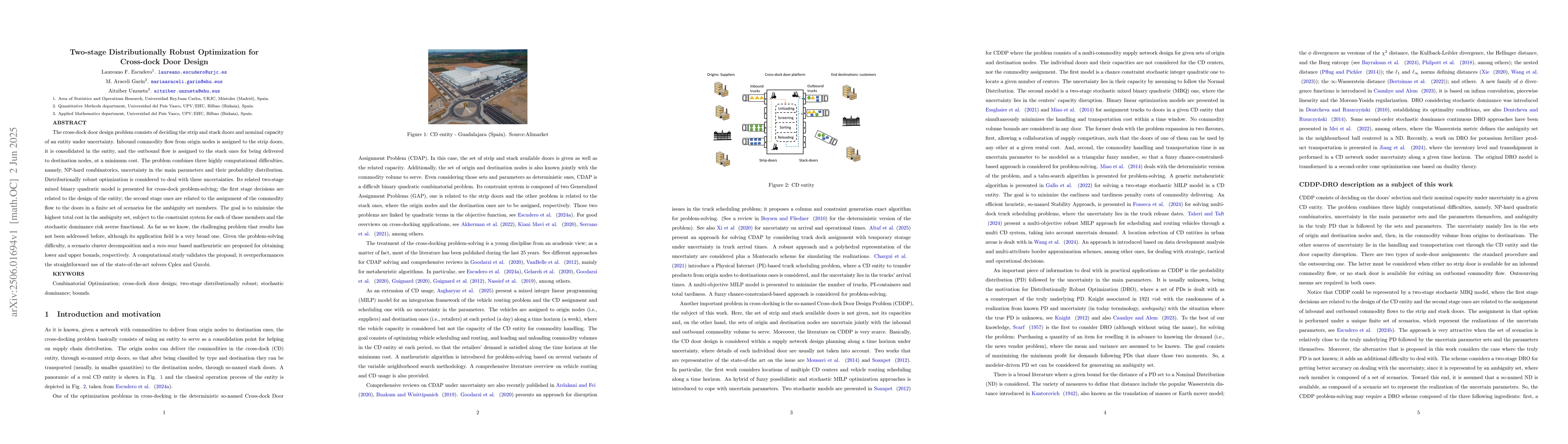 This paper proposes a two-stage distributionally robust optimization method to design an efficient cross-dock door system under uncertainty, outperforming existing solvers in computational complexity.