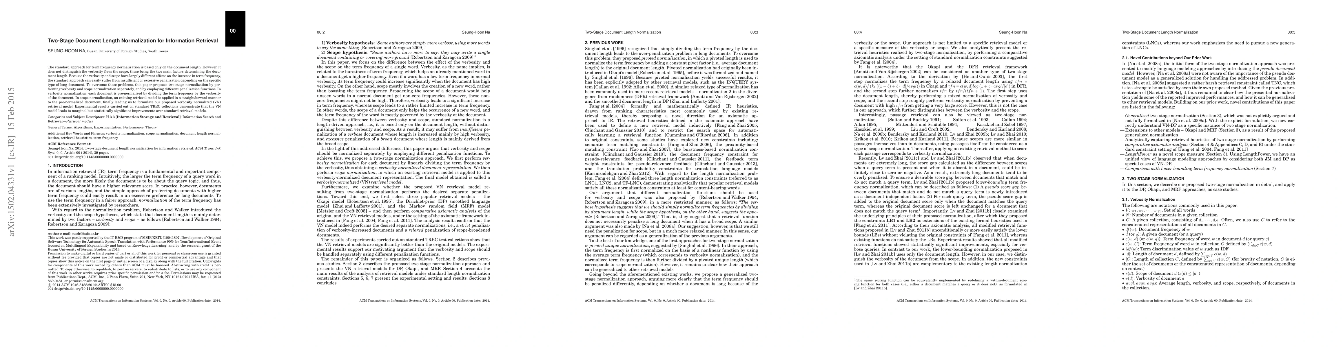 This paper introduces a two-stage document length normalization method for information retrieval, distinguishing between verbosity and scope factors affecting document length. The approach involves pre-normalizing by verbosity and then applying an existing retrieval model, resulting in marginal yet statistically significant performance improvements over standard models, as proven on TREC collections.