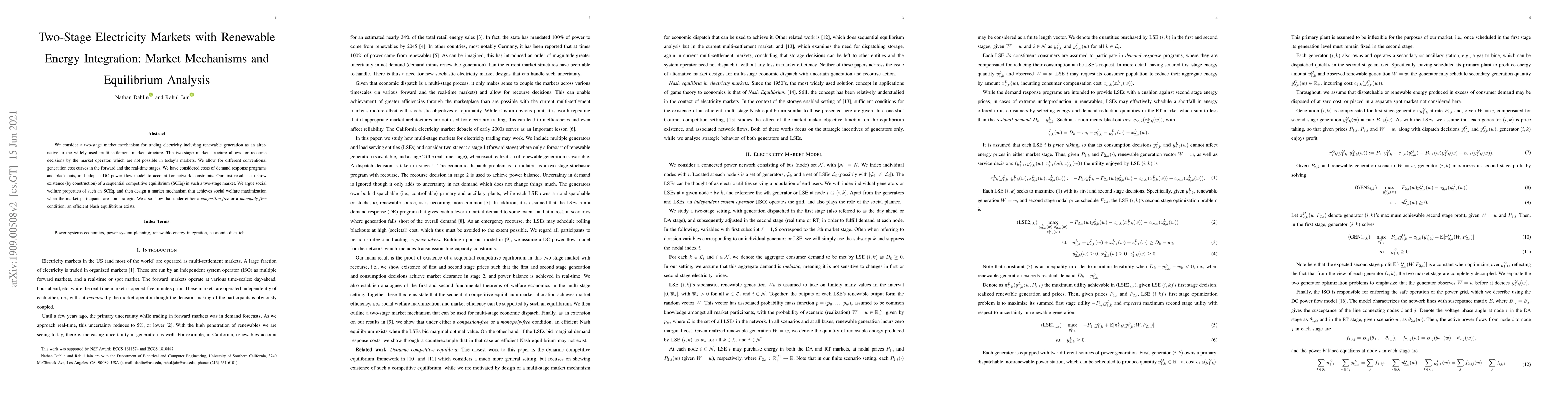 This paper explores a two-stage electricity market mechanism that integrates renewable energy and allows for recourse decisions. It demonstrates the existence of a sequential competitive equilibrium and proposes a market design for social welfare maximization, showing efficient Nash equilibrium under certain conditions.