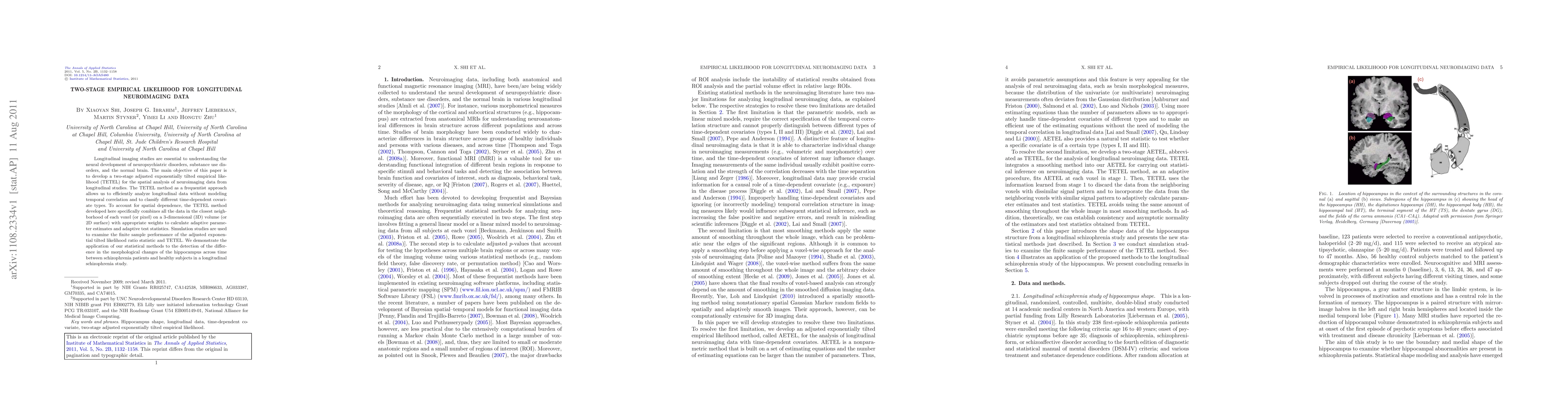 This paper develops a two-stage adjusted exponentially tilted empirical likelihood (TETEL) method for analyzing longitudinal neuroimaging data, enabling efficient spatial analysis without modeling temporal correlation. The TETEL method incorporates spatial dependence by combining data from neighboring voxels, and is demonstrated through its application in detecting hippocampal morphological changes in schizophrenia patients versus healthy subjects.